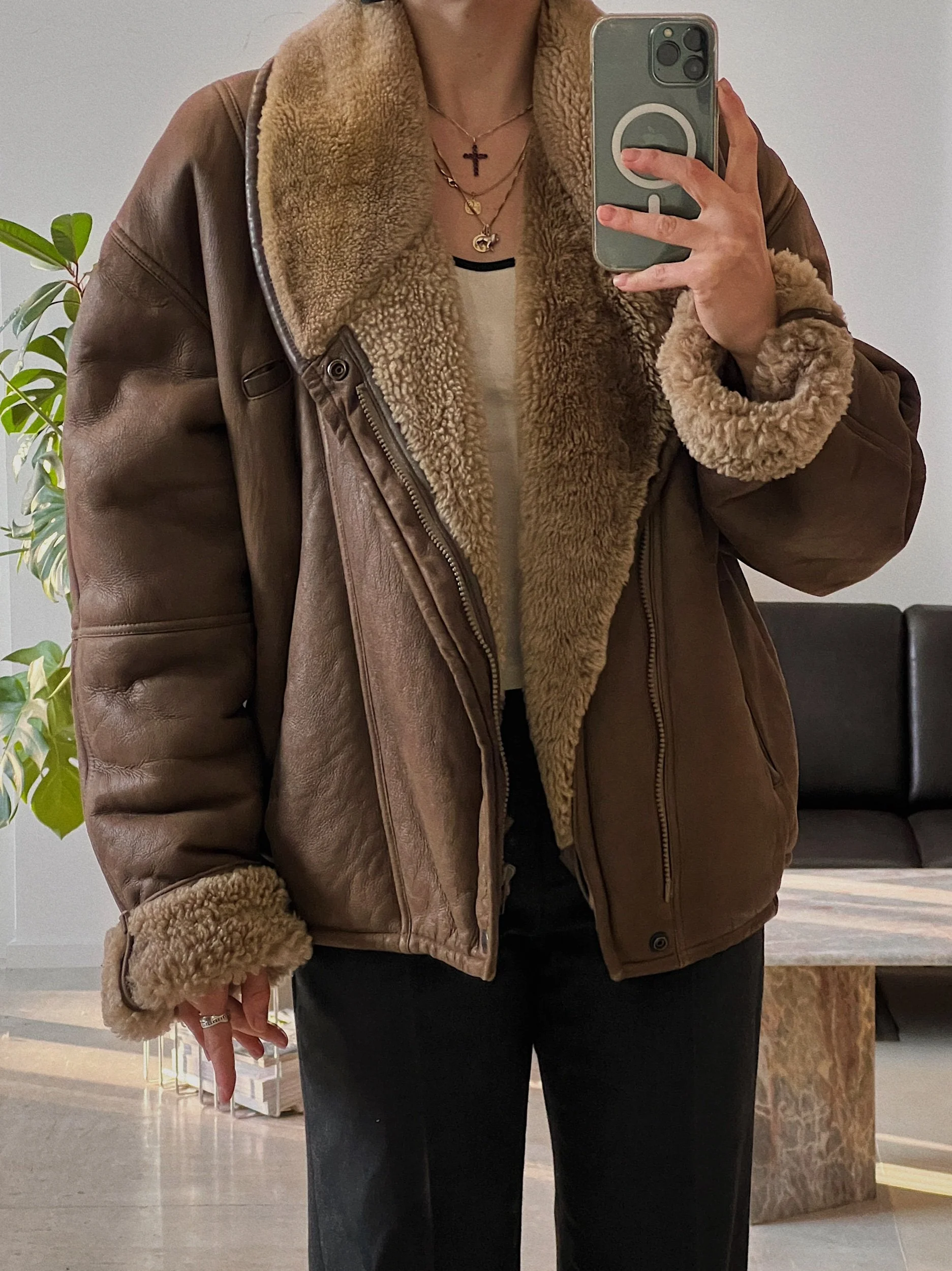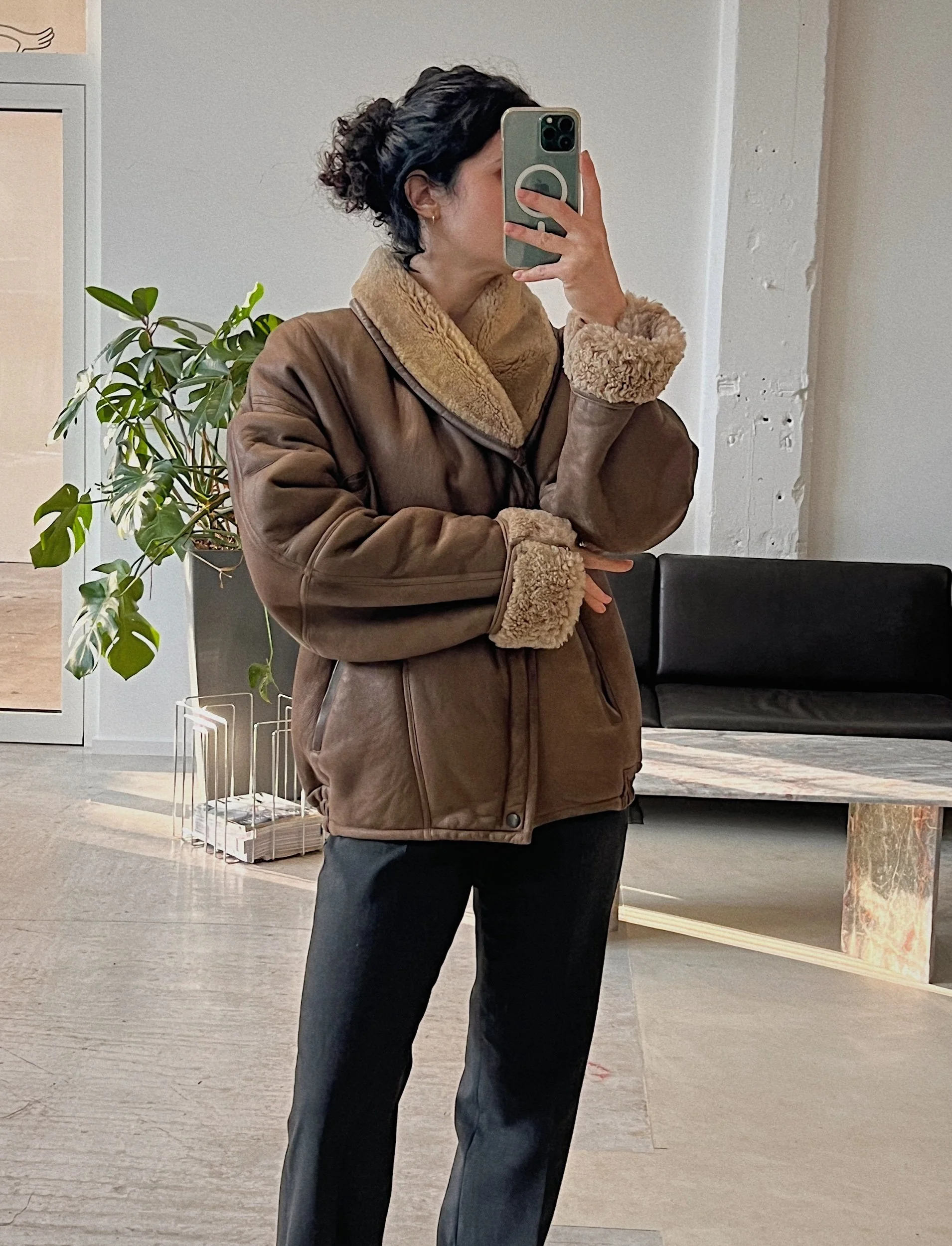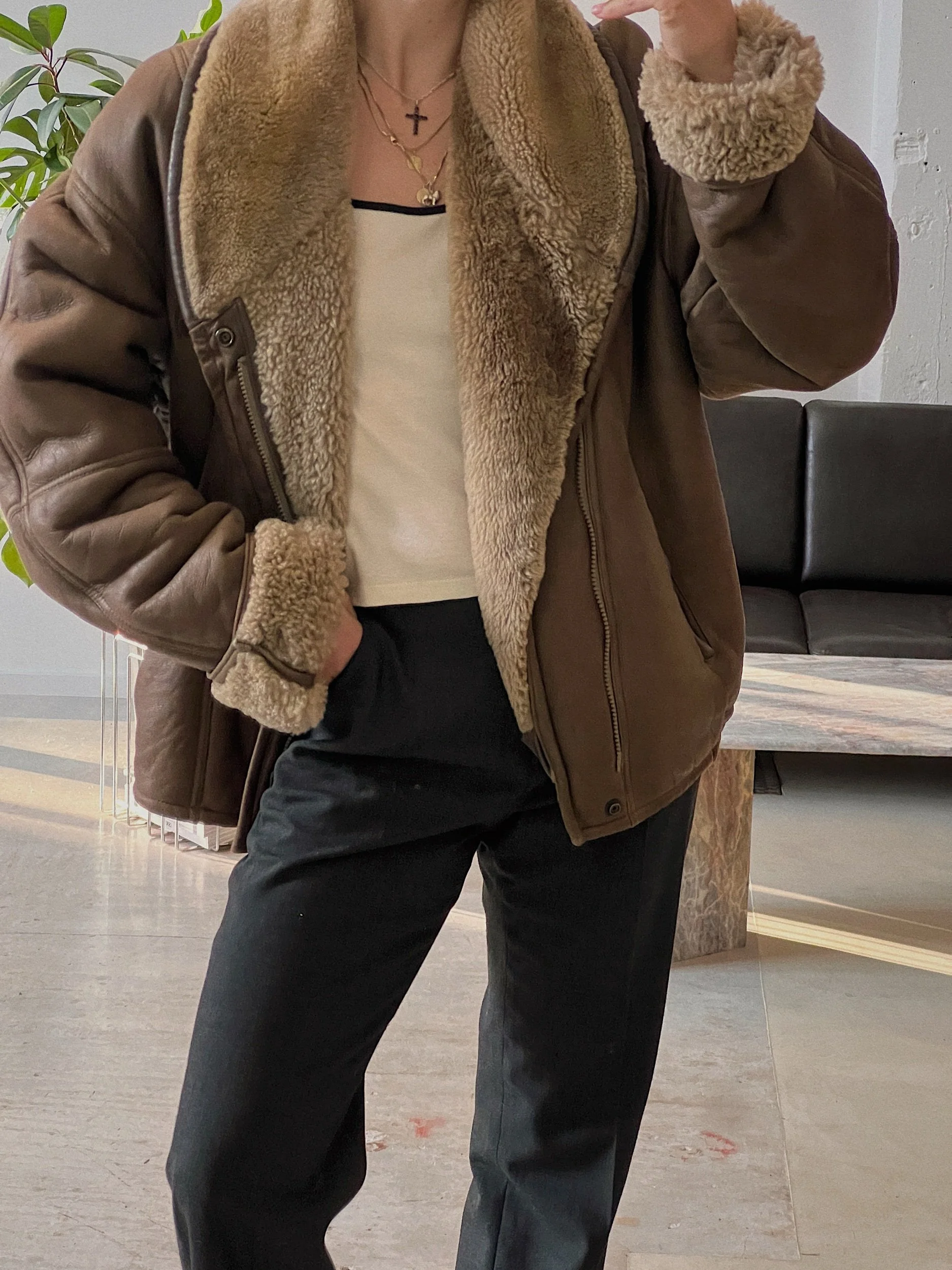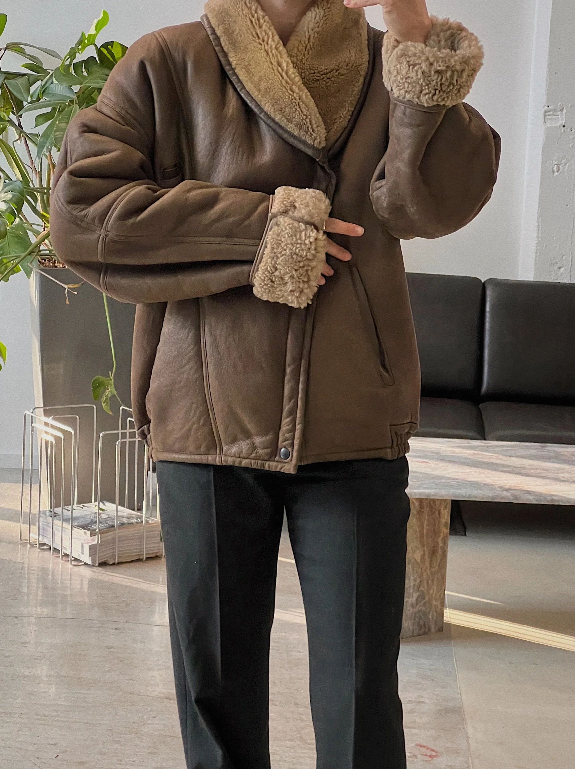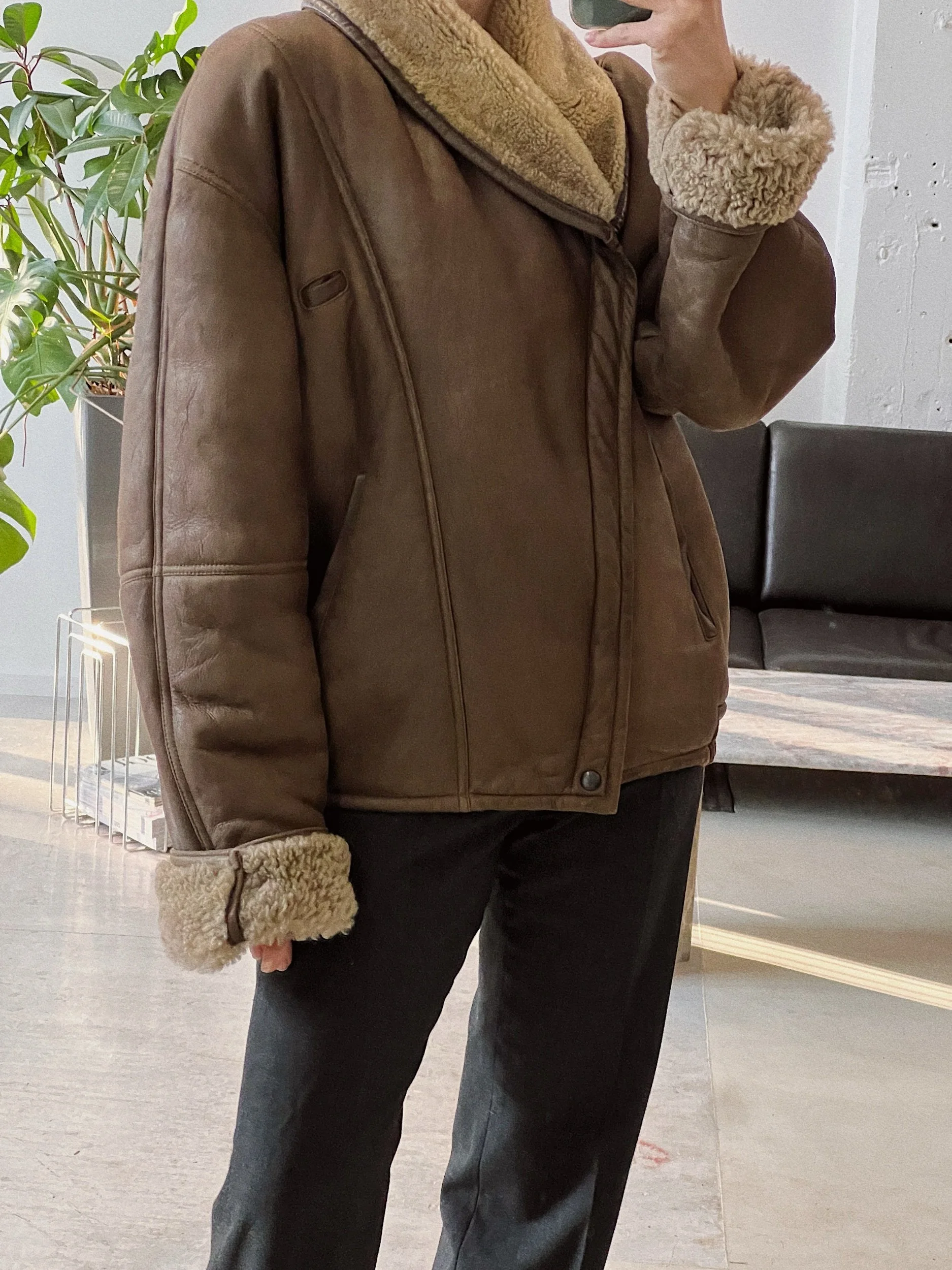 100% shearling, heavy weight, bomber cut, side pockets, zipper & snap button closure