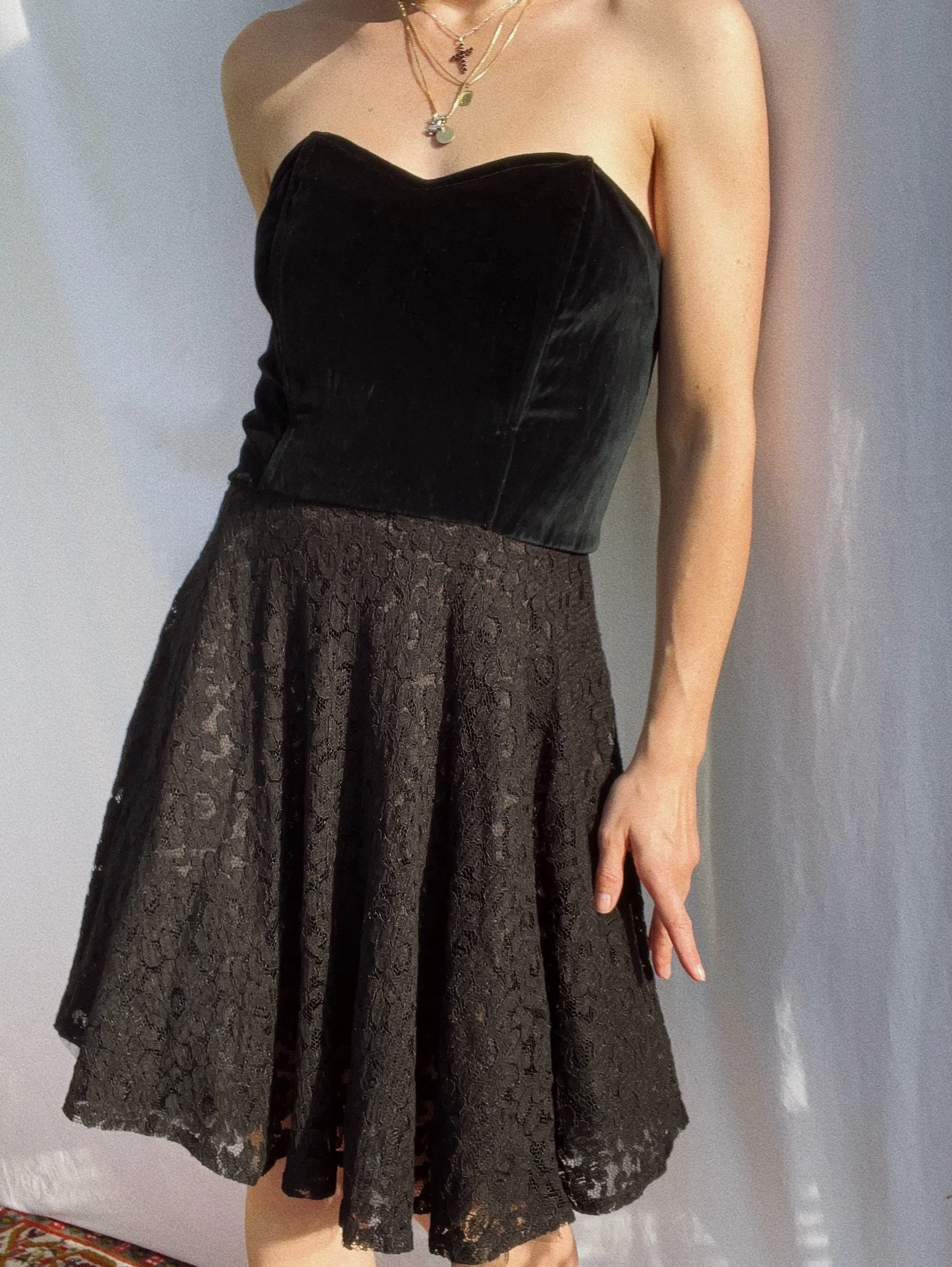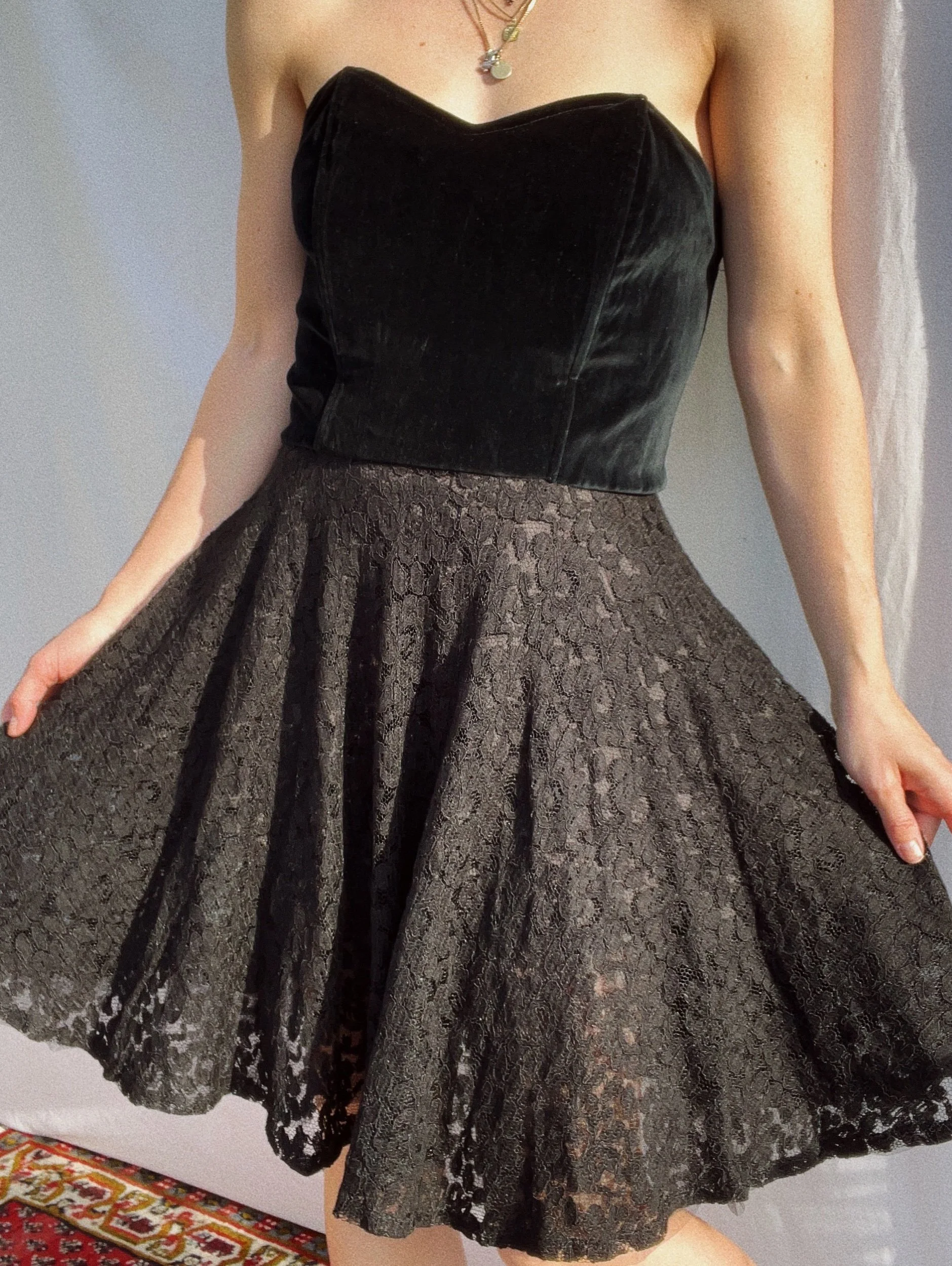 boned corsage top made from cotton velvet, lace skirt with lining & tulle underneath, zipper on the back, tagged as size M 100% cotton