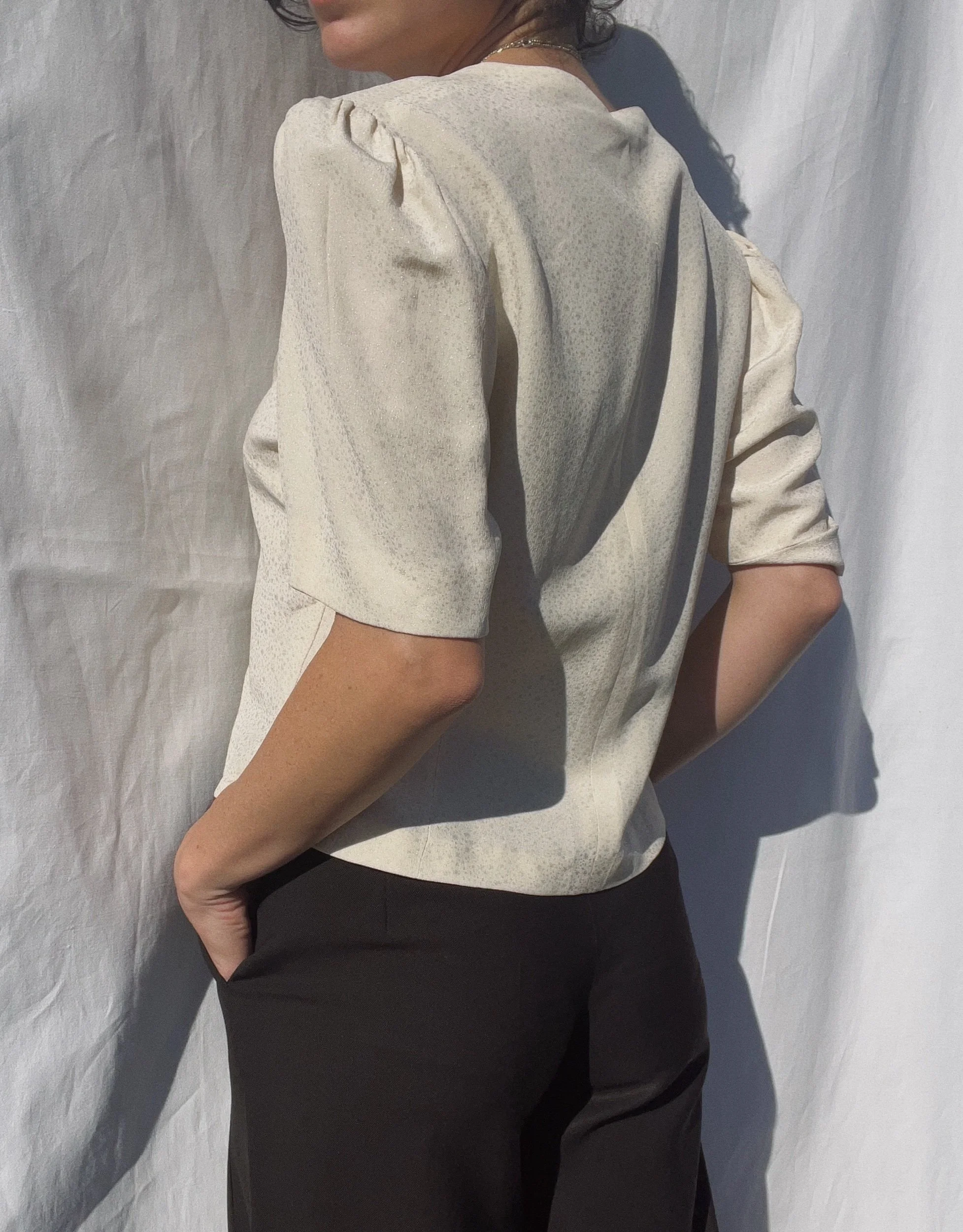 tailormade, fitted cut, slightly puffed sleeves, see-through buttons, glittery jacquard pattern with stars and dots