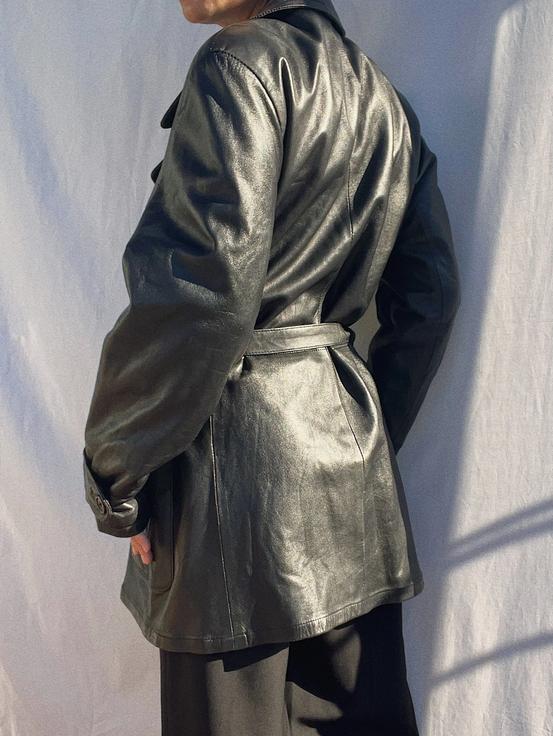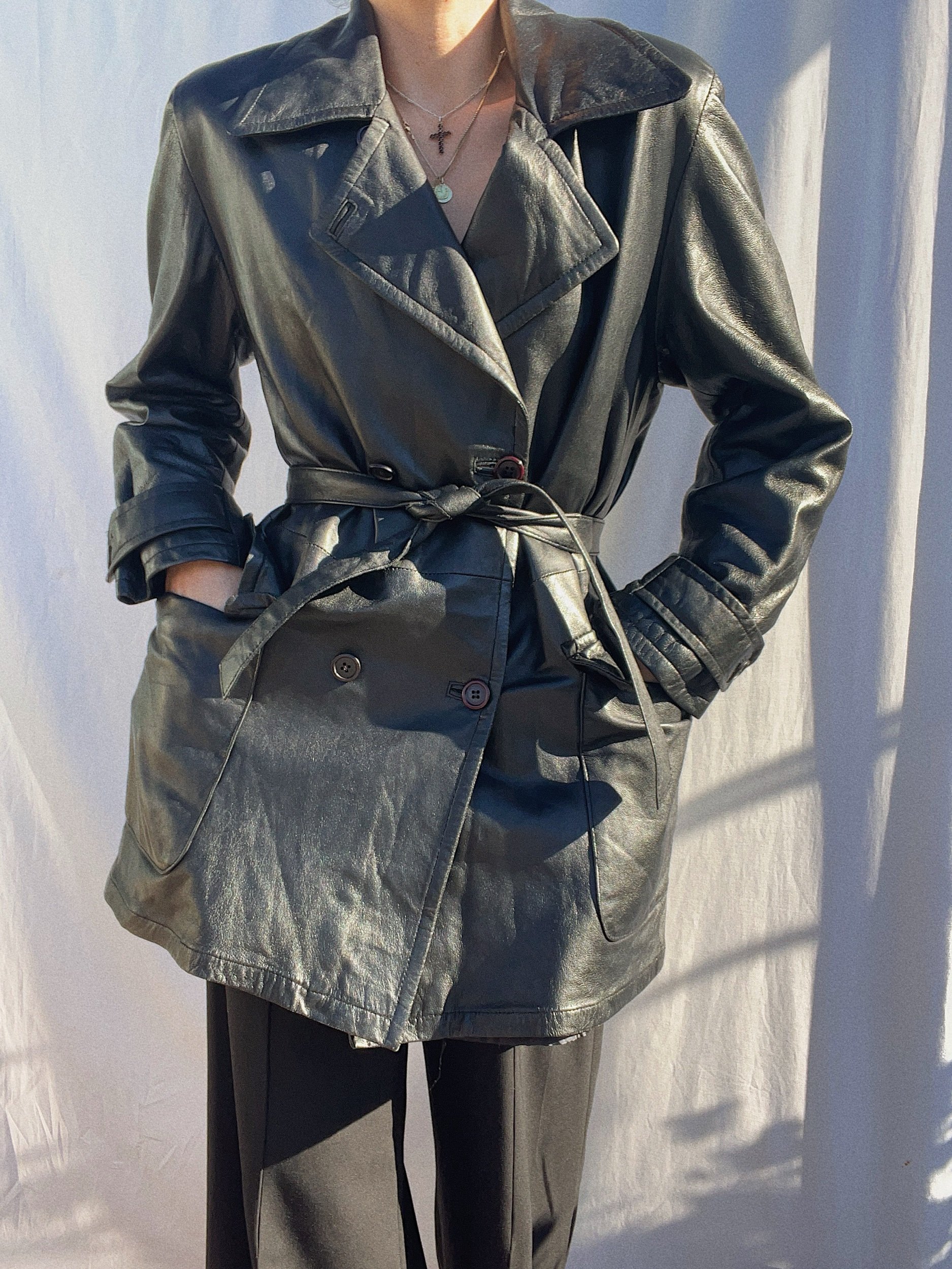 soft genuine leather, fully lined, two pockets, light shoulderpads, matching belt