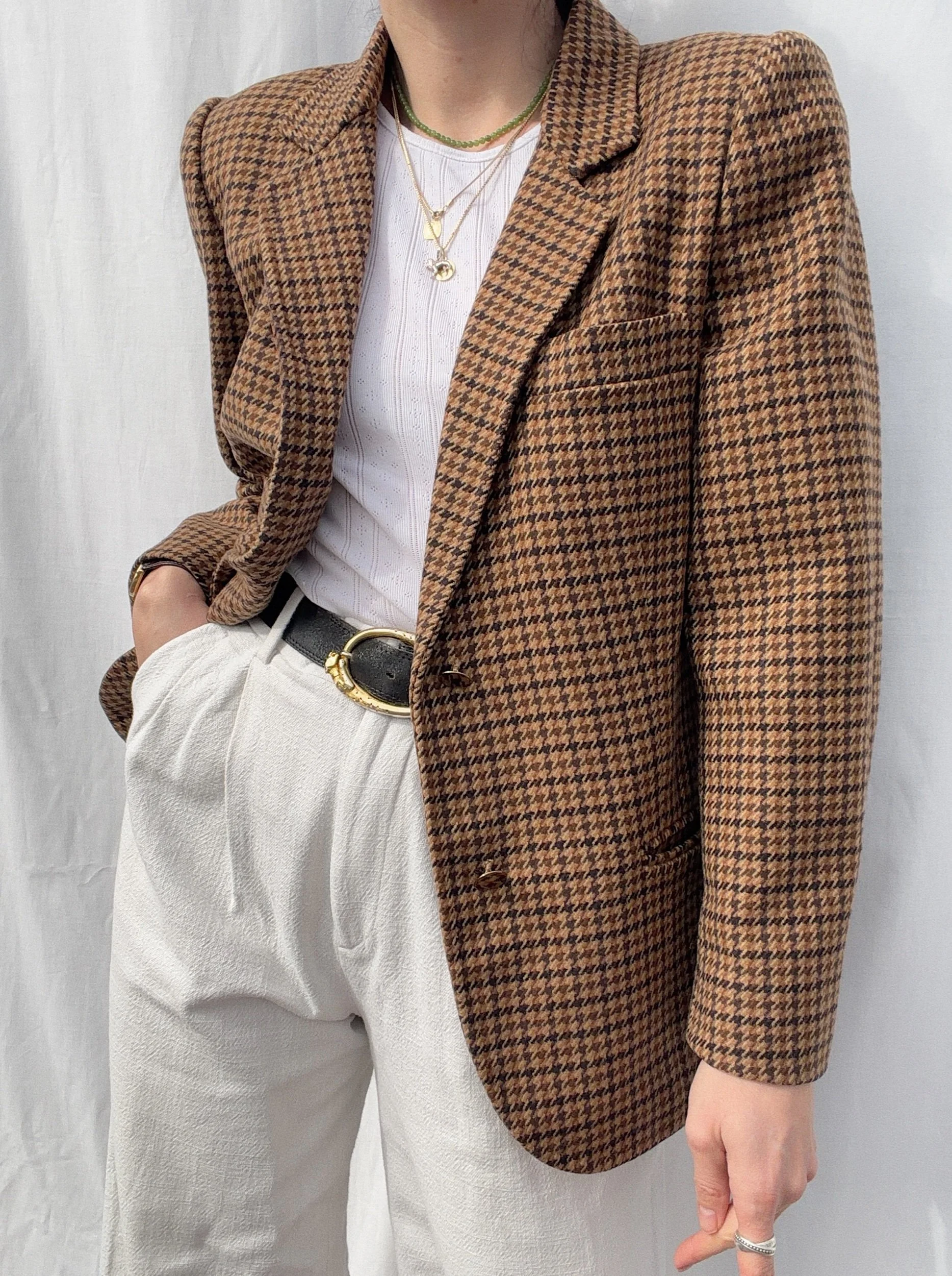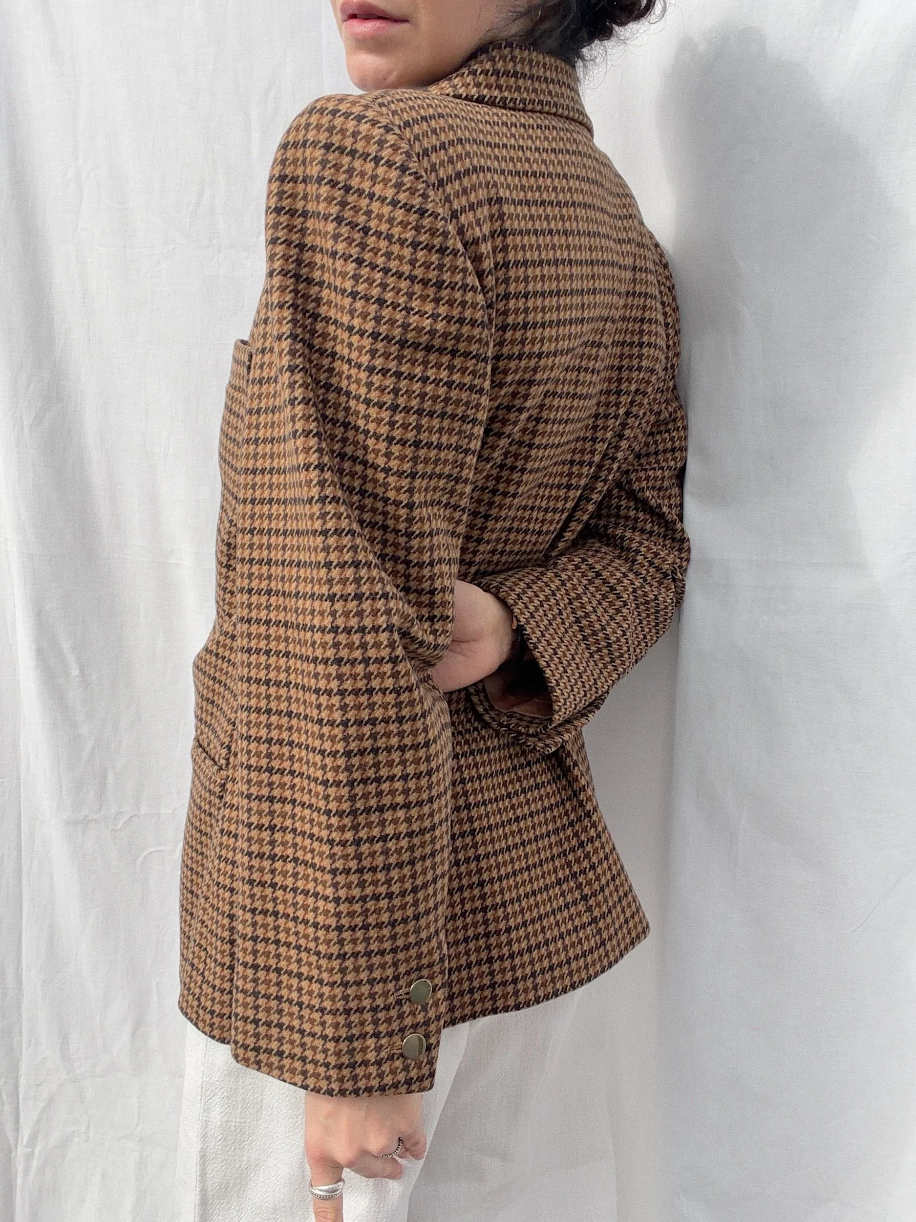 100% merino wool, fully lined, shoulderpads, sleek gold buttons