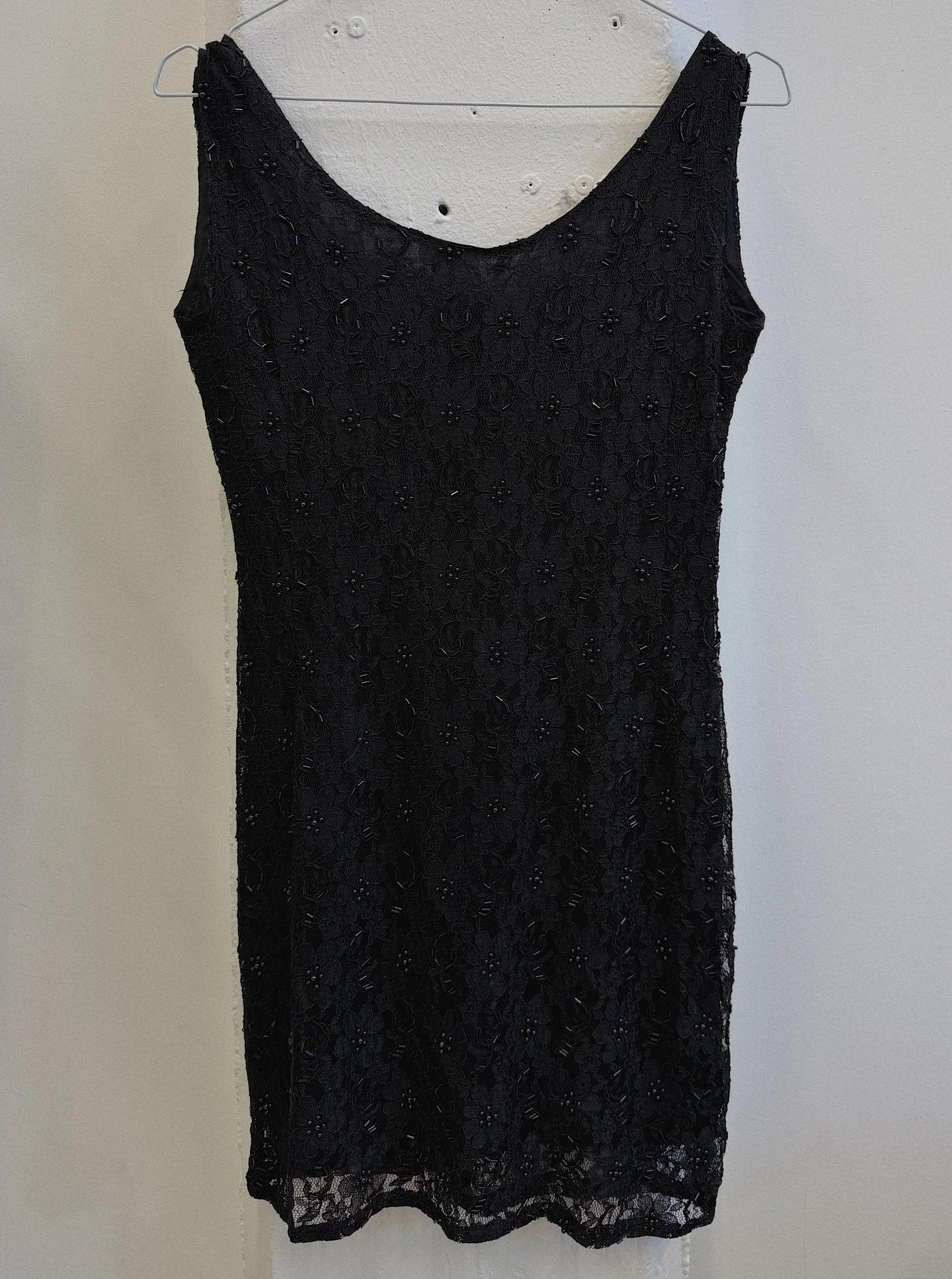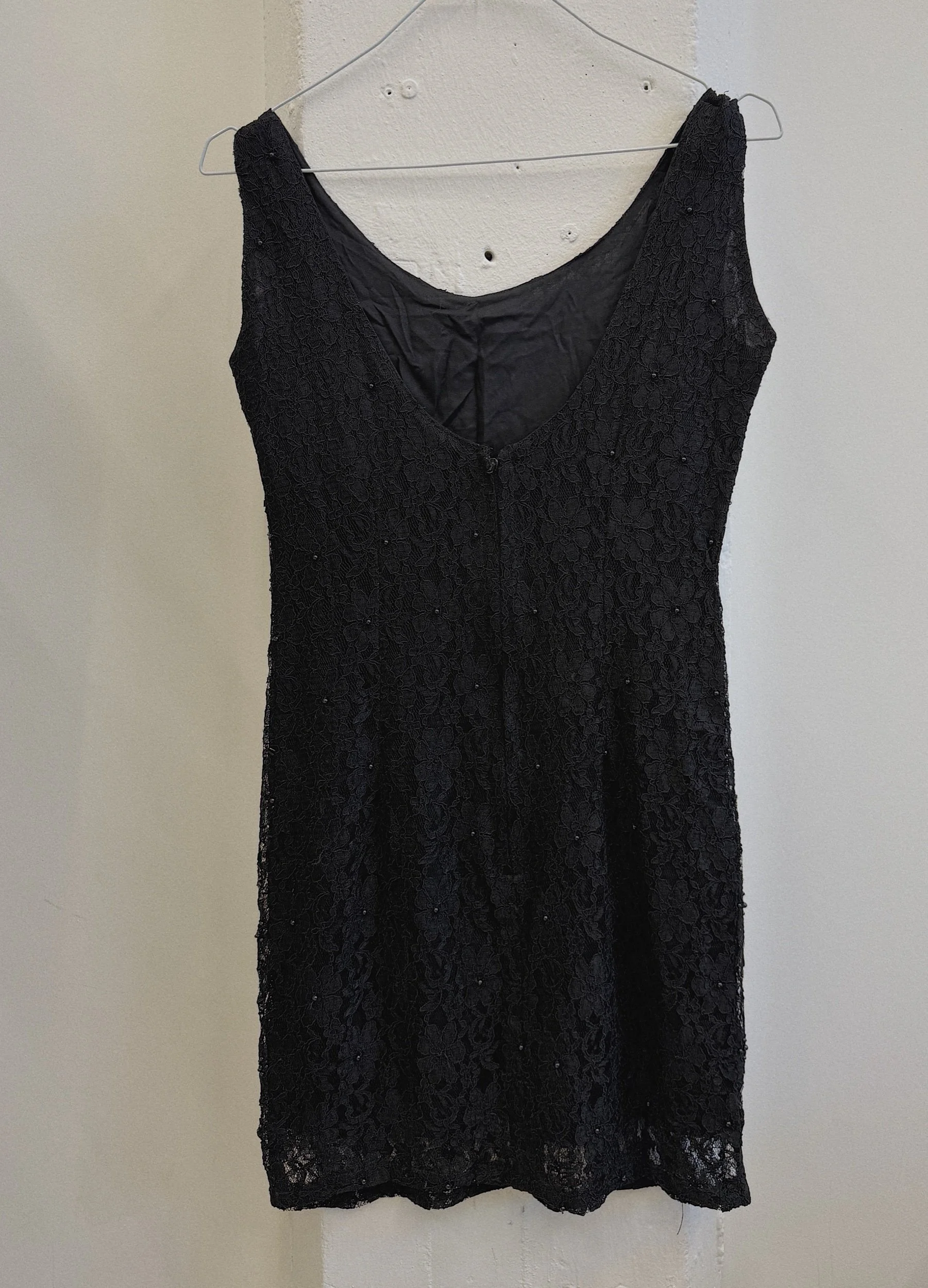 probably polyamide with pearl embroidery and cotton lining, zipper on the back