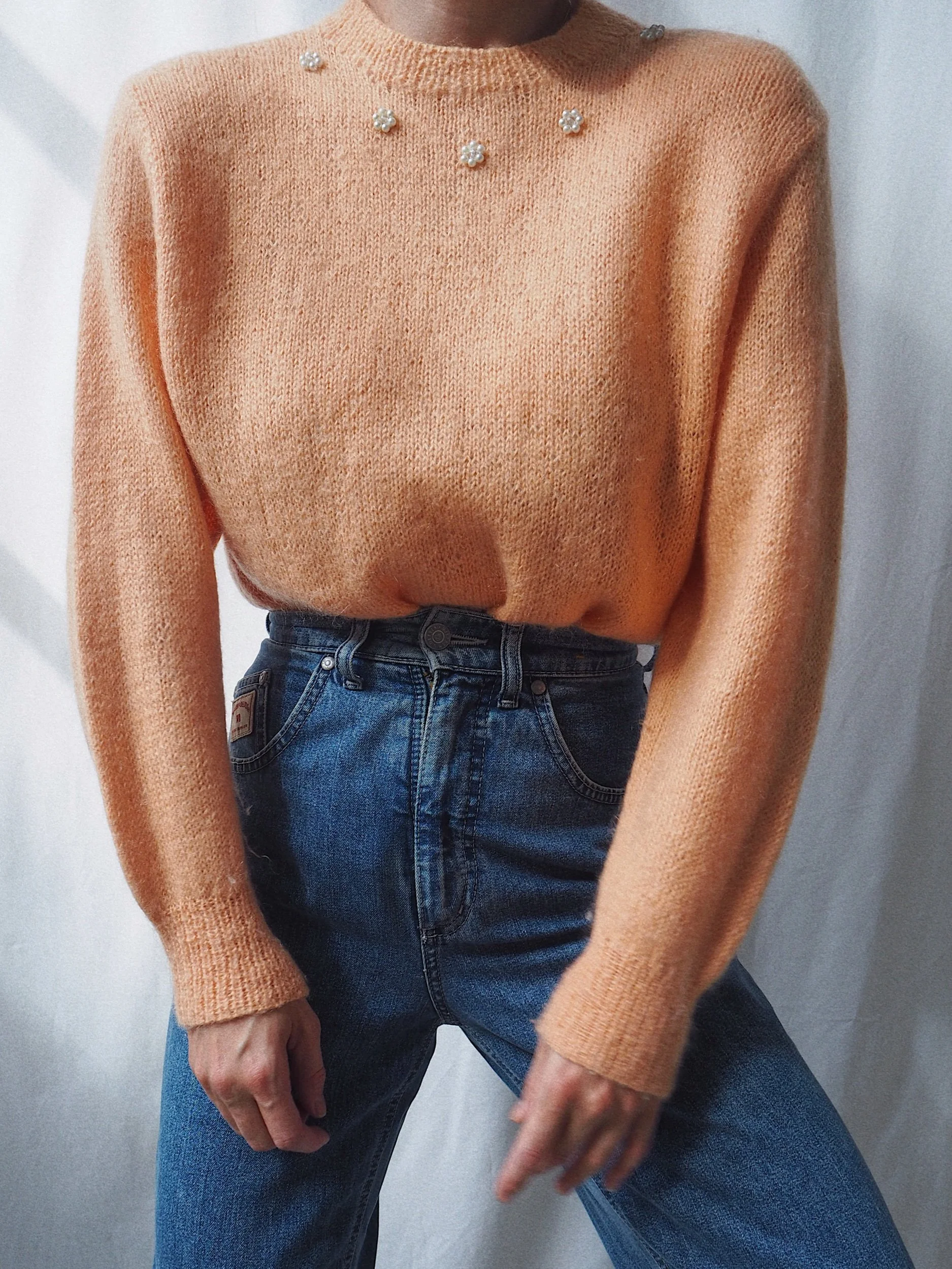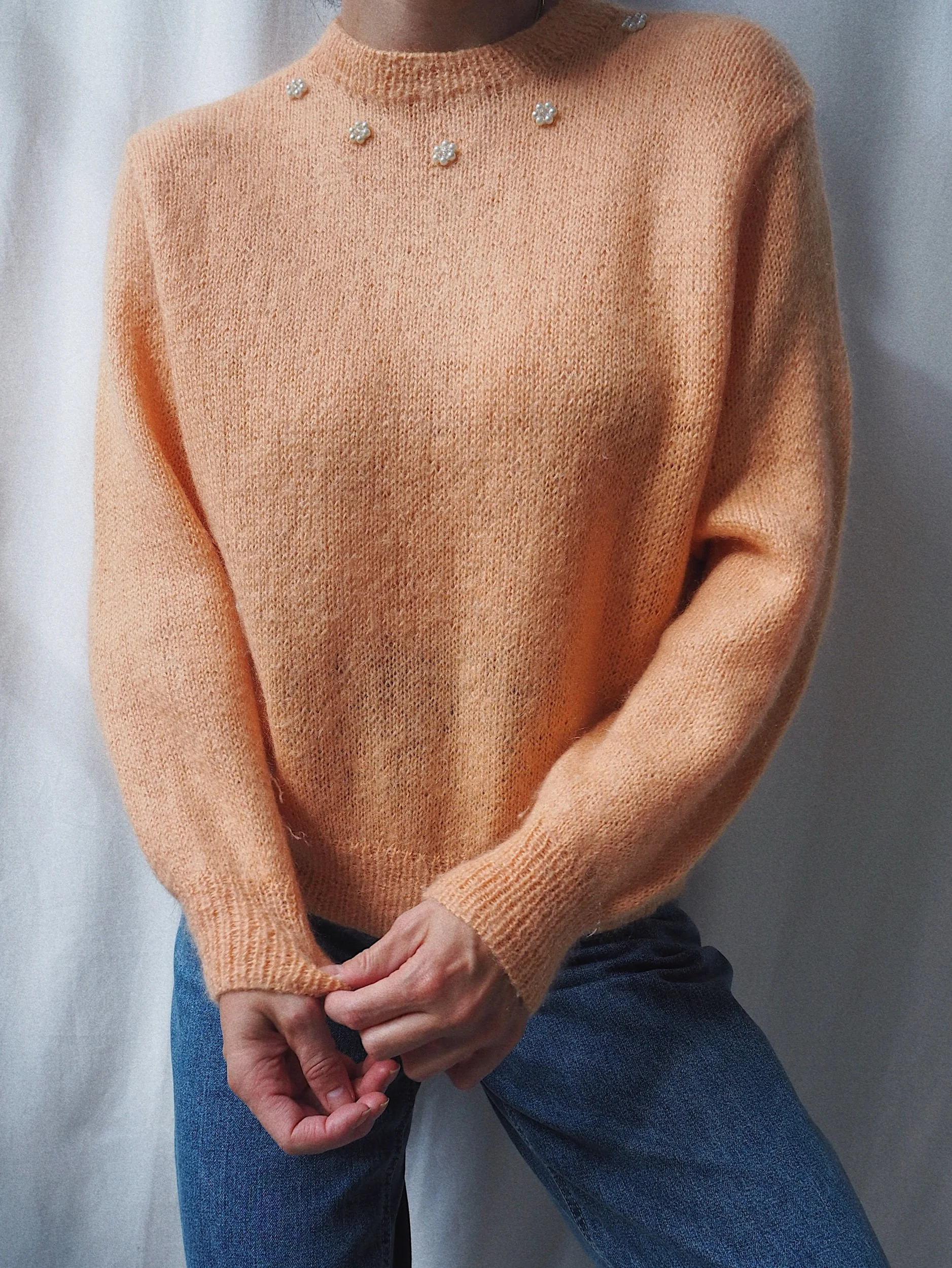 handmade, mohair-merino knit, buttons on the back, pearl embroidery