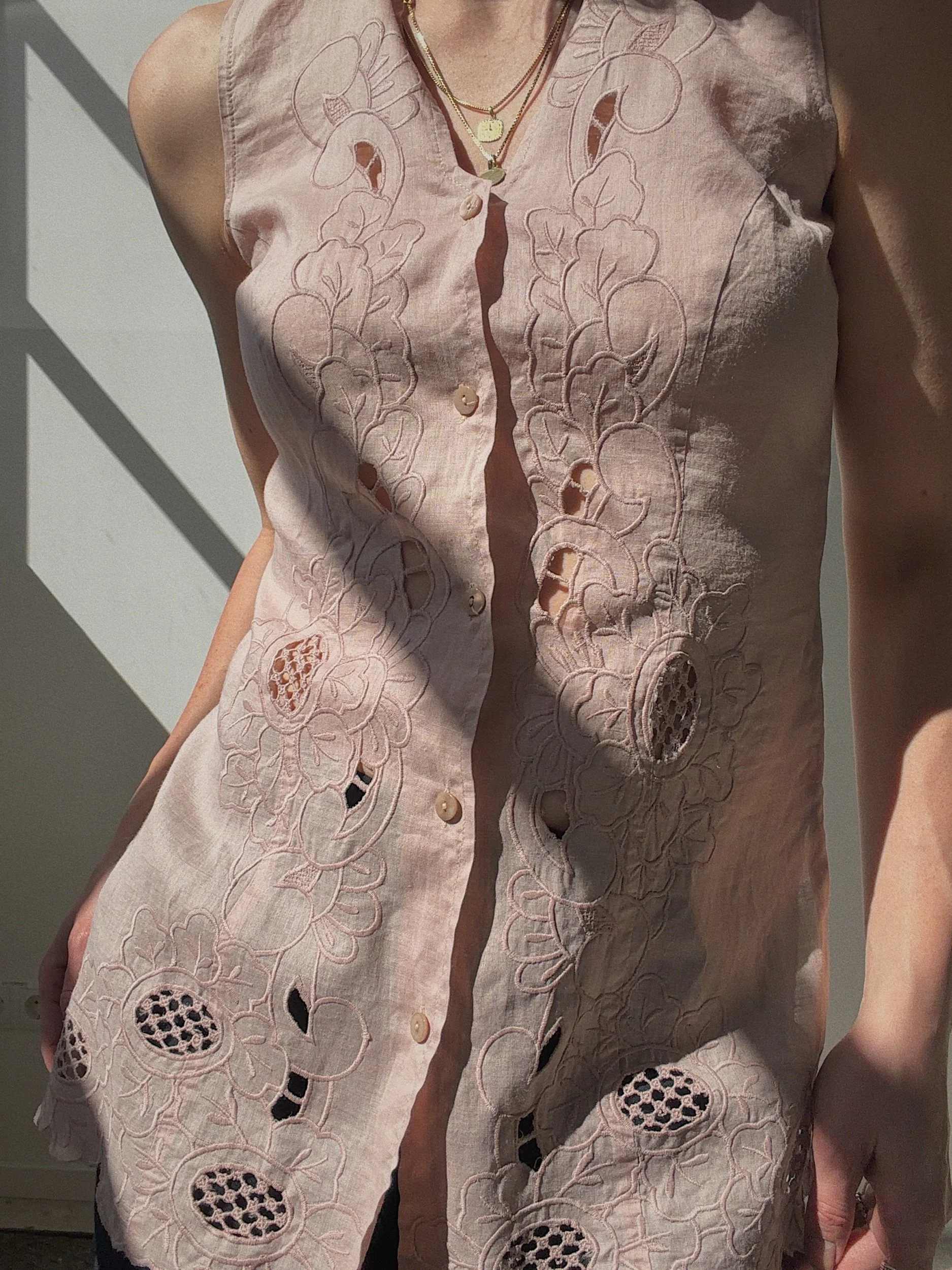 linen cotton blend, fitted cut, amazing cut-out embroidery details in soft almond