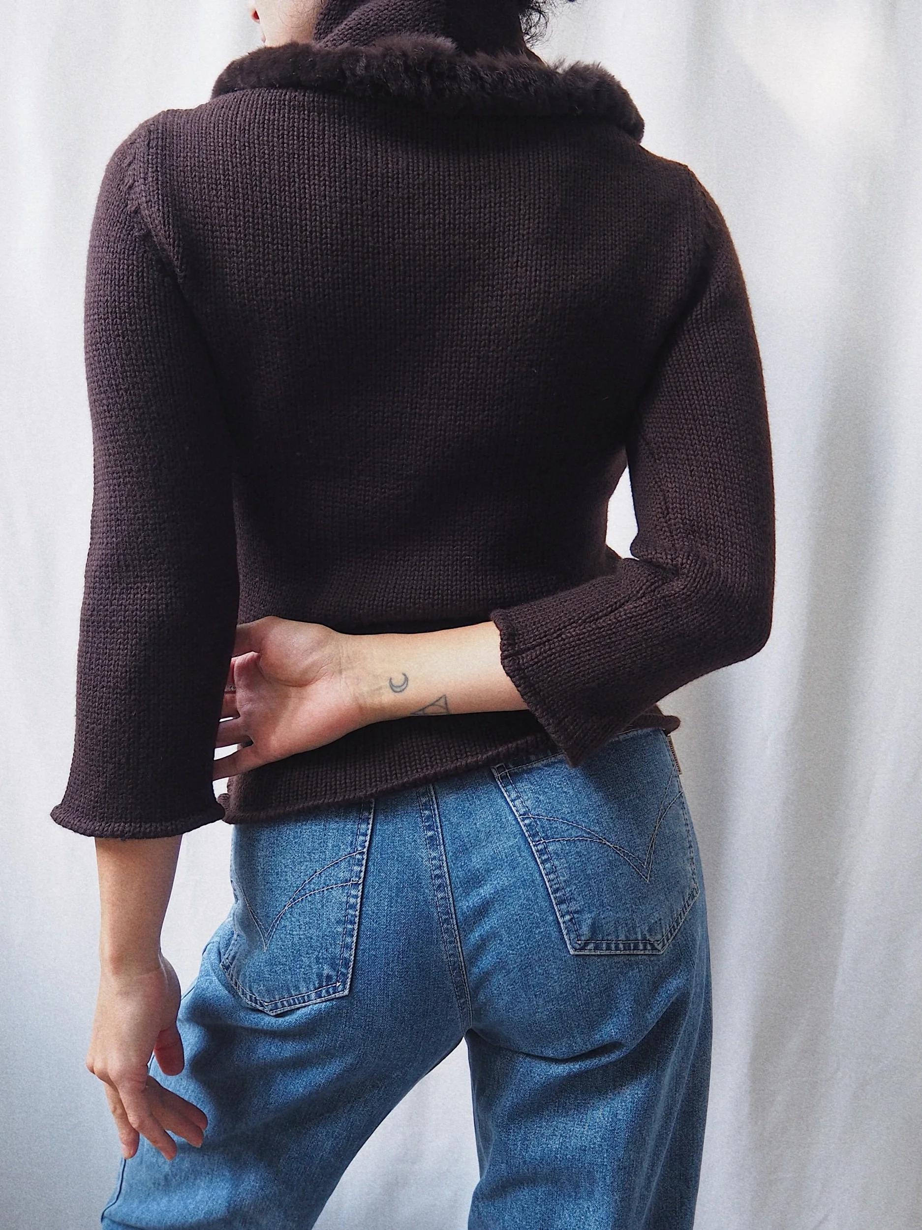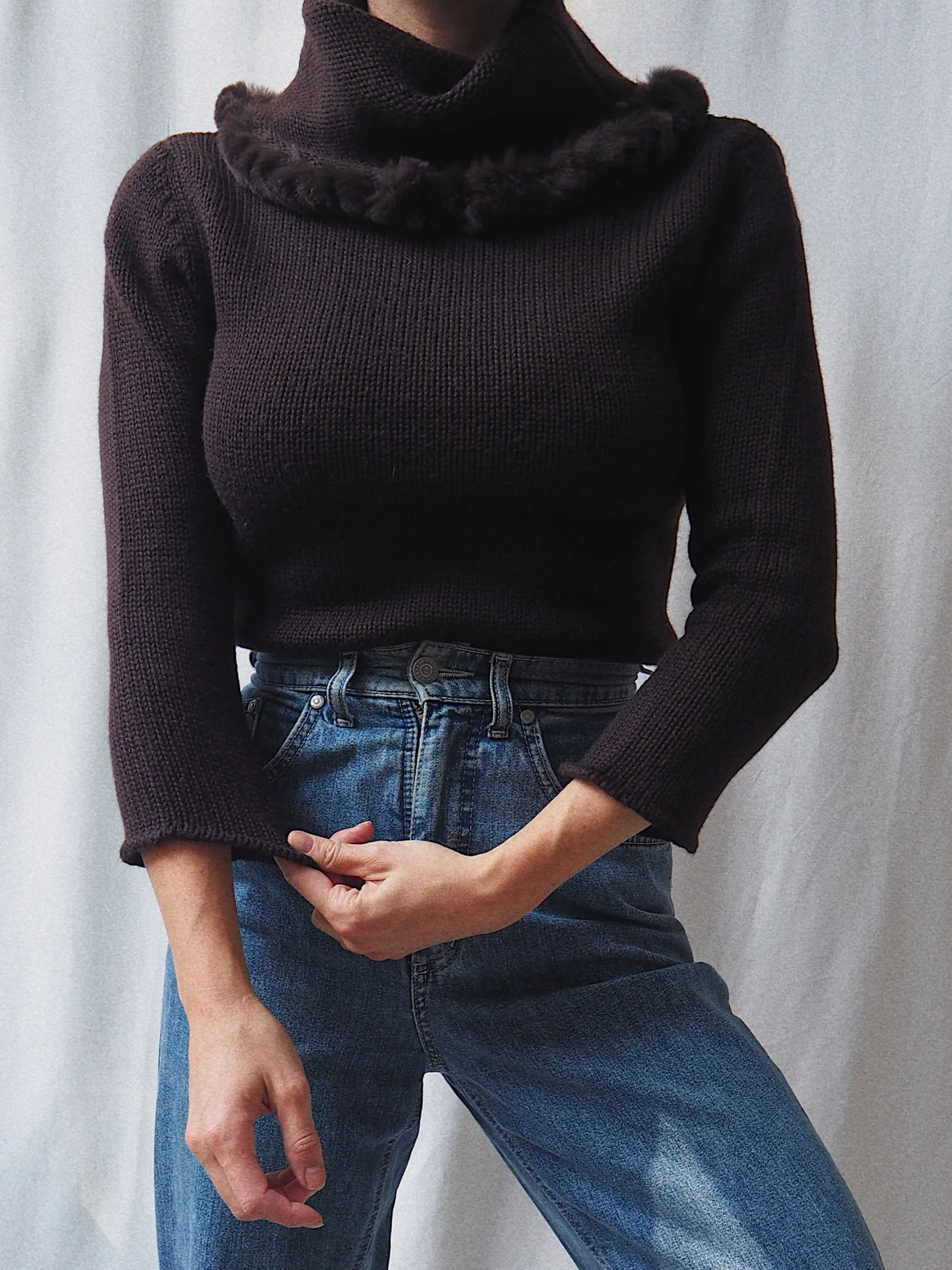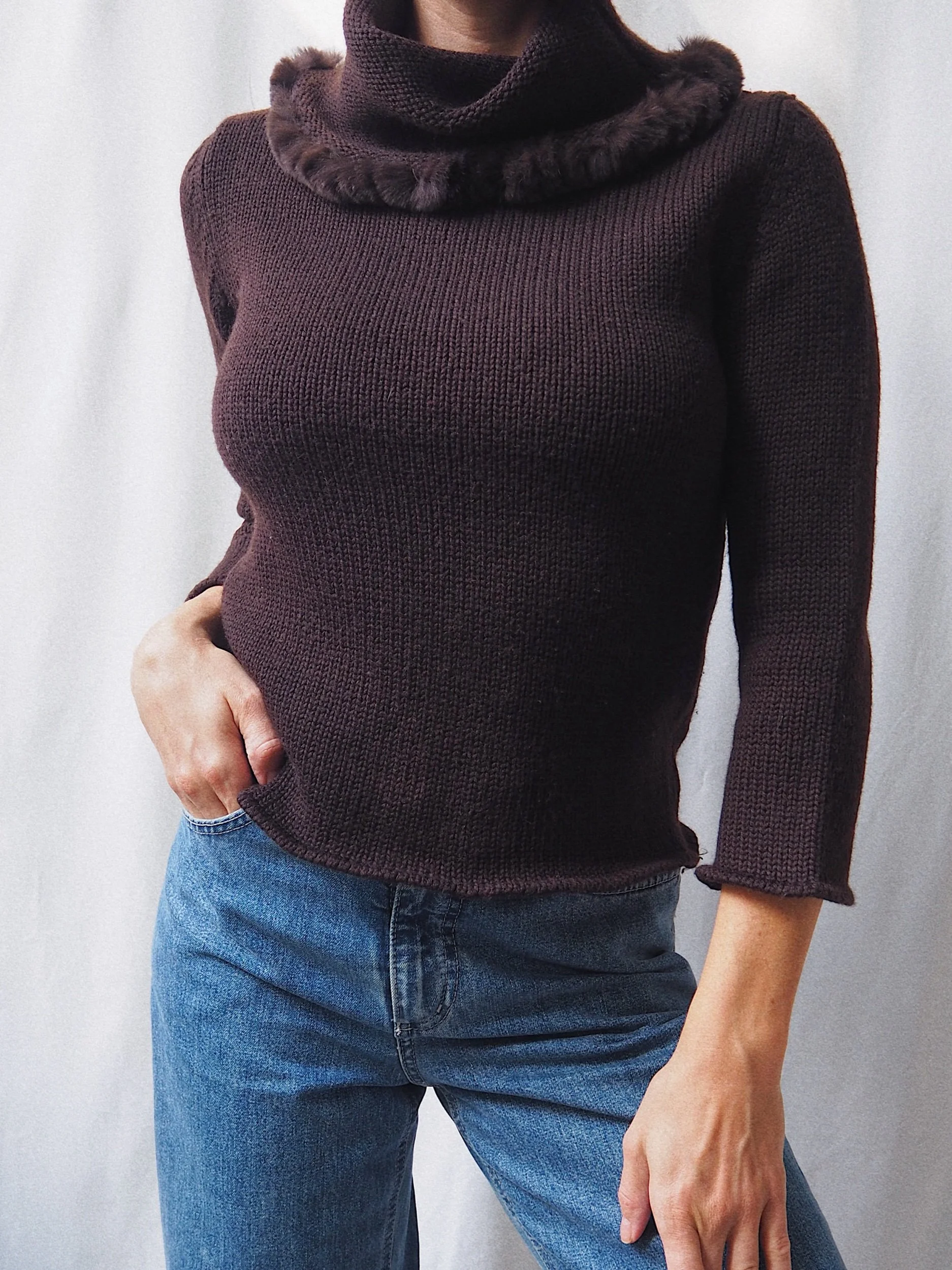 Vintage Elegant Sweater Fur Trim Dark Brown