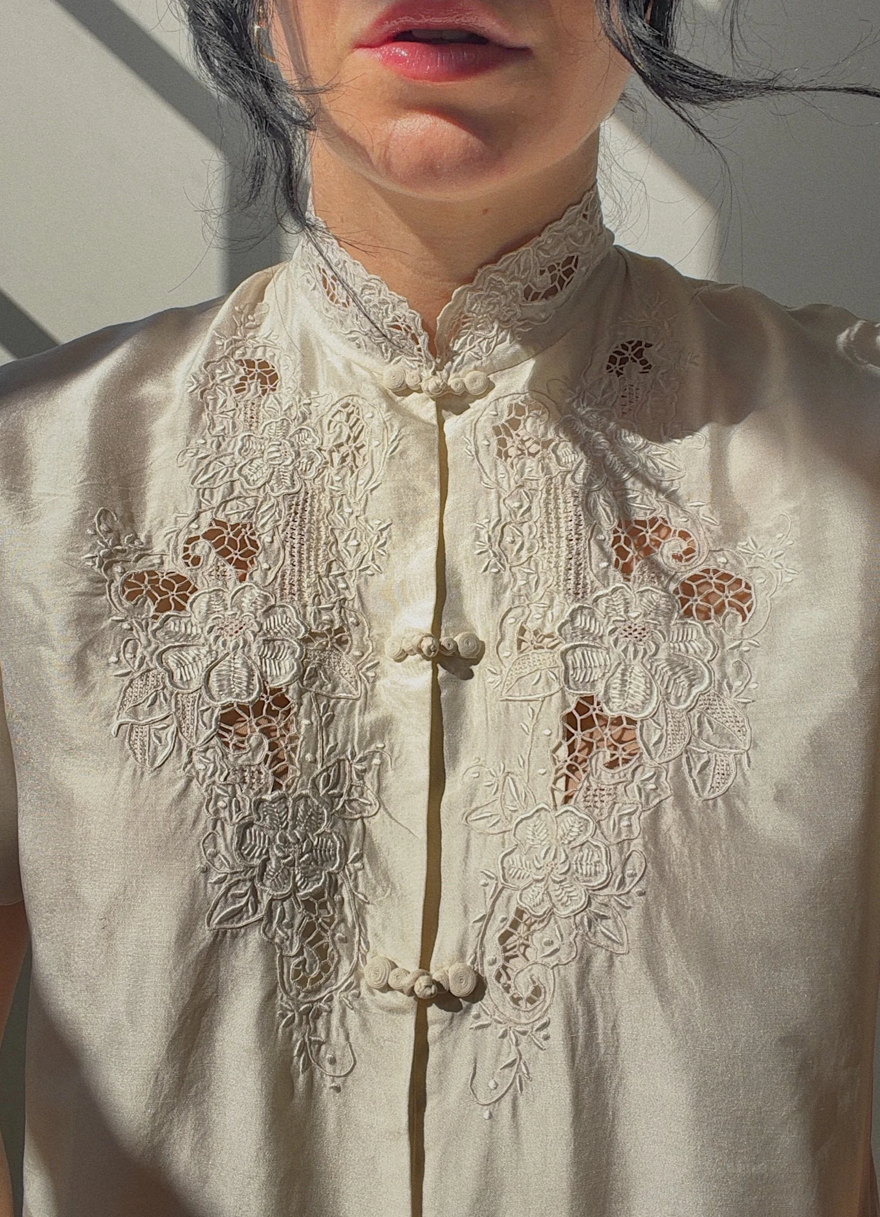100% silk, handmade embroidery, frog closure