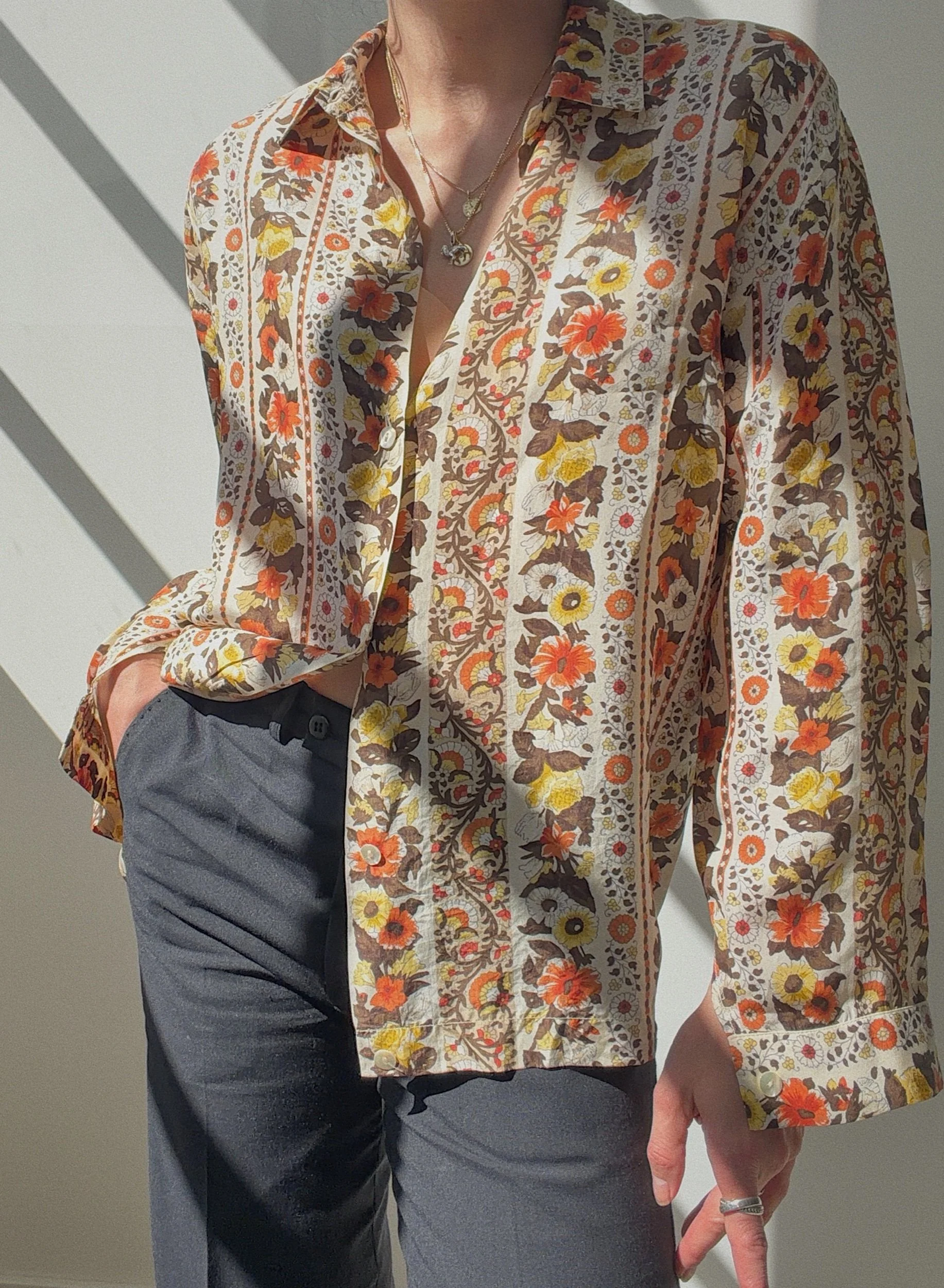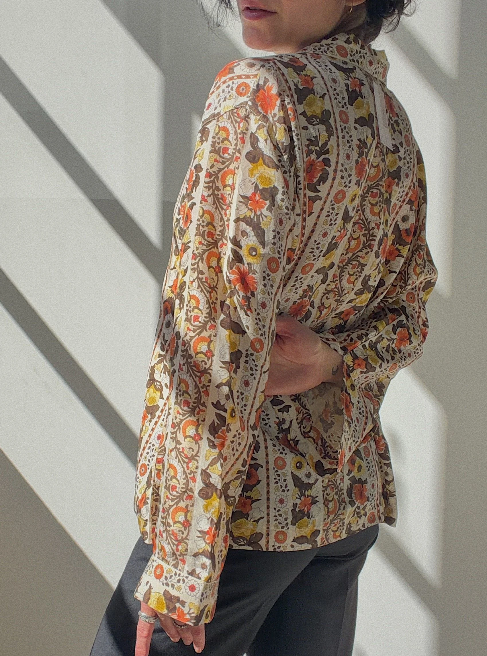 silk blend blouse, 70s inspired flowerprint