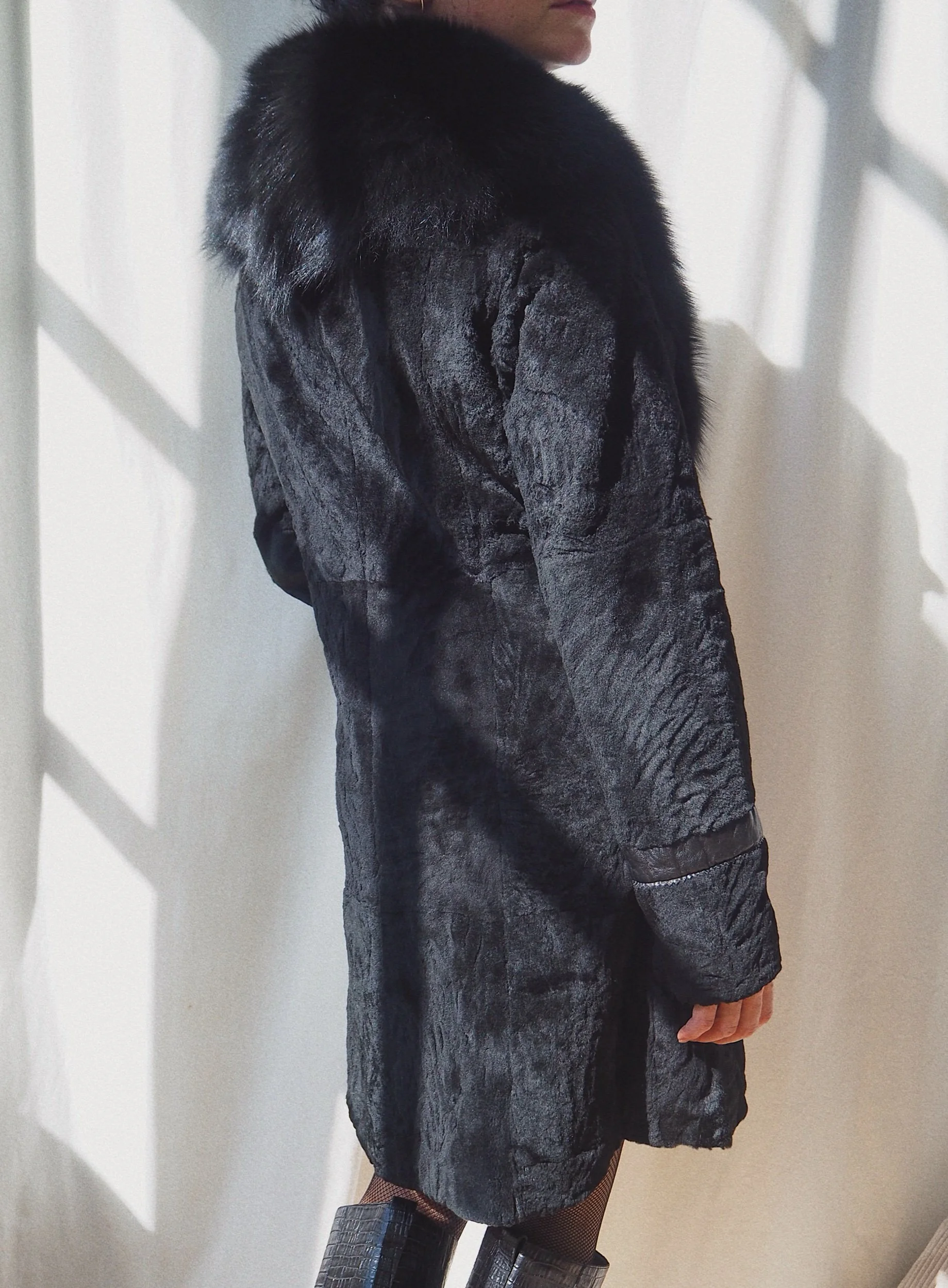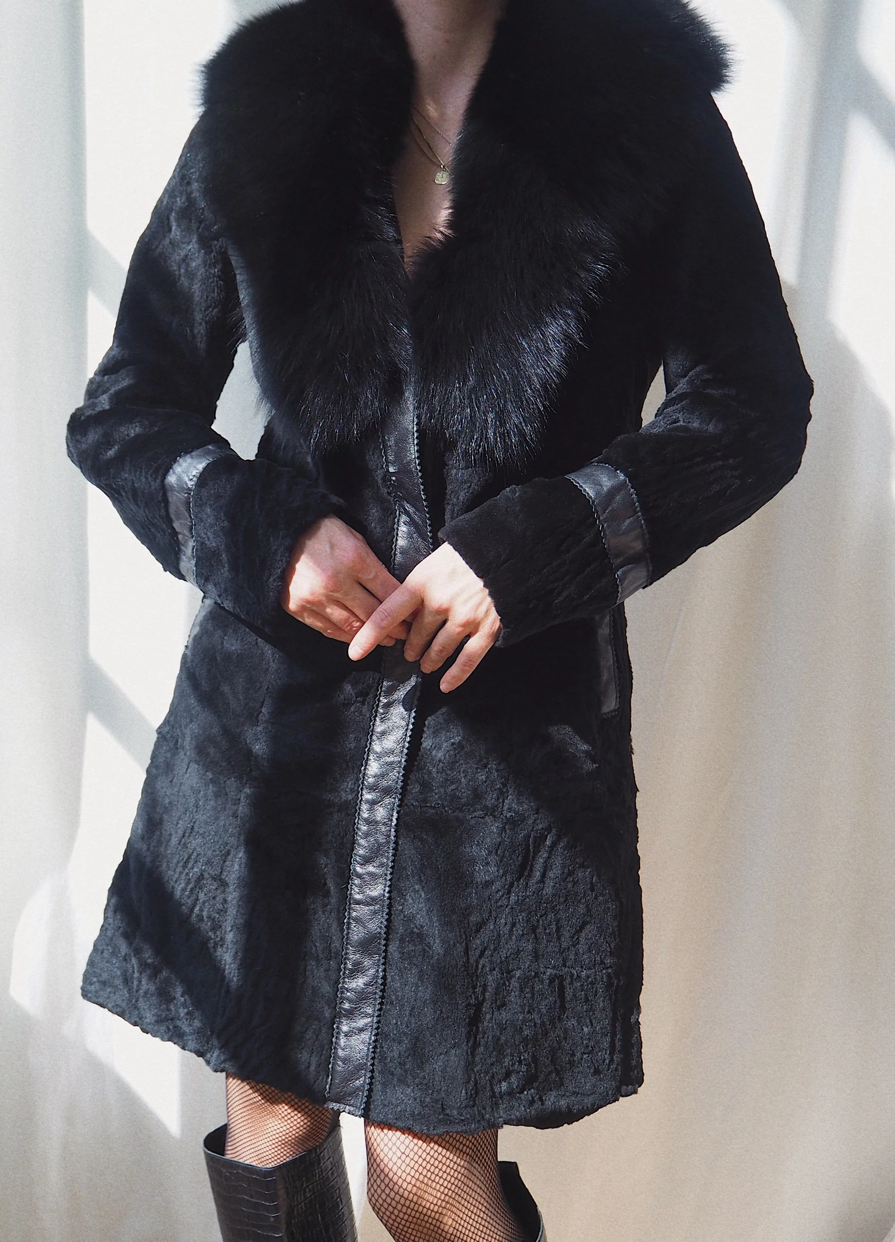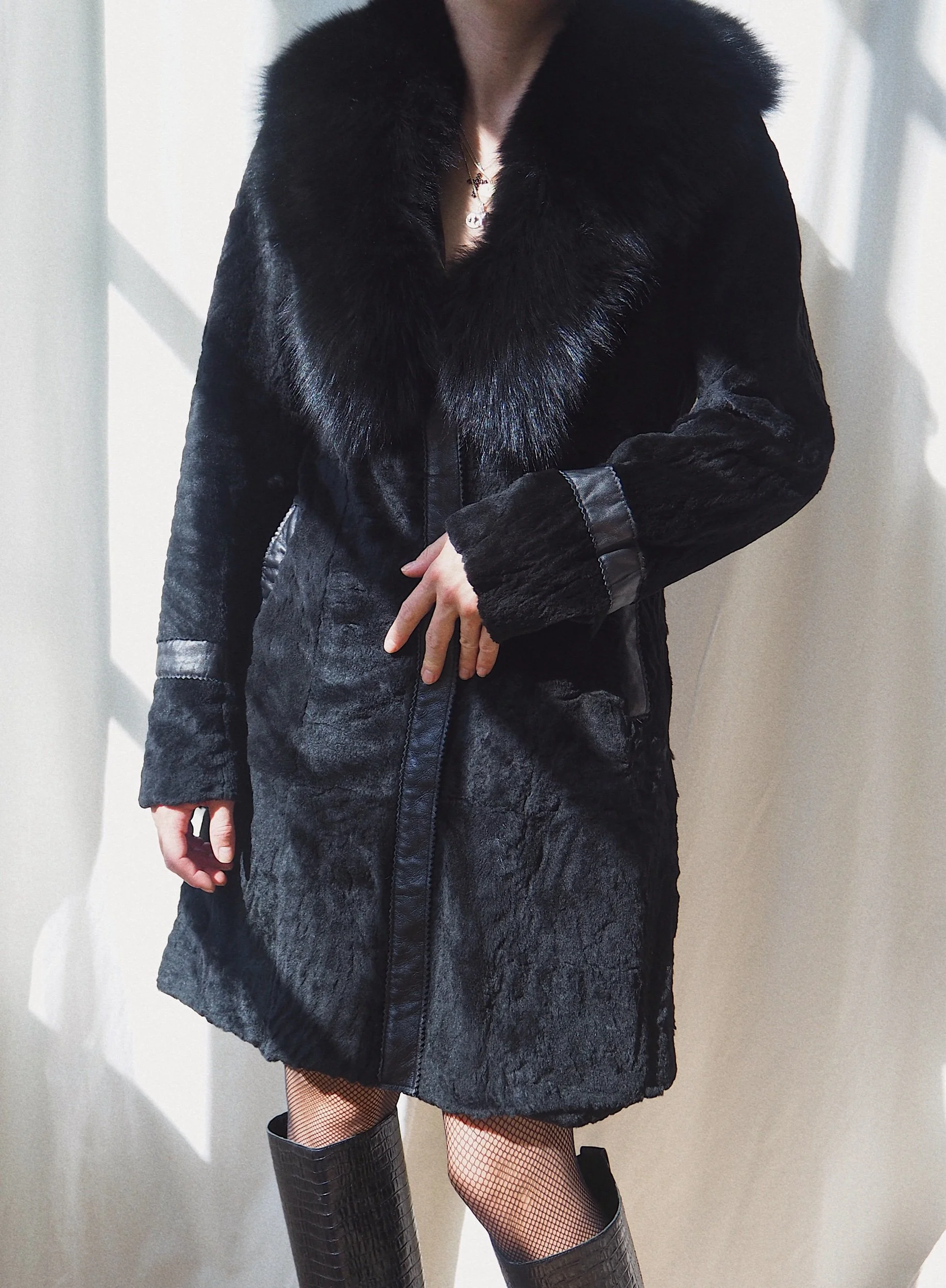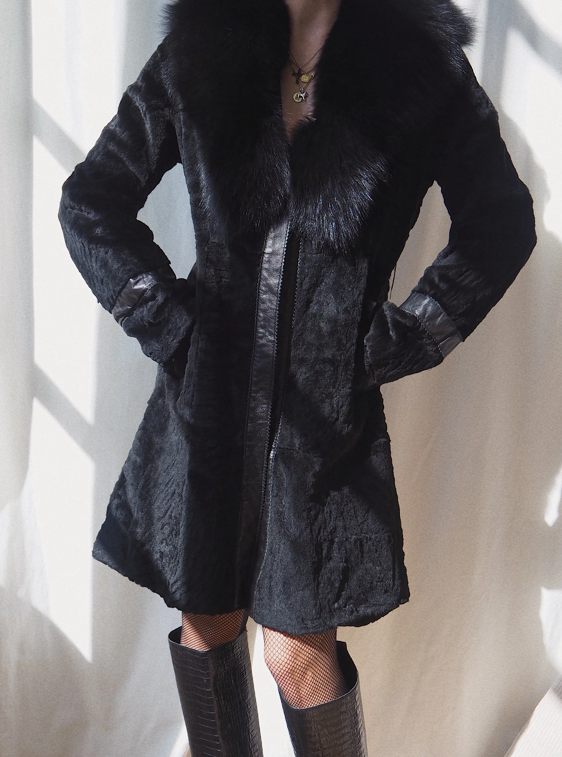 100% fur with genuine leather details, quite light & flexible fabric, fully lined, one snap button to close on front, side pockets