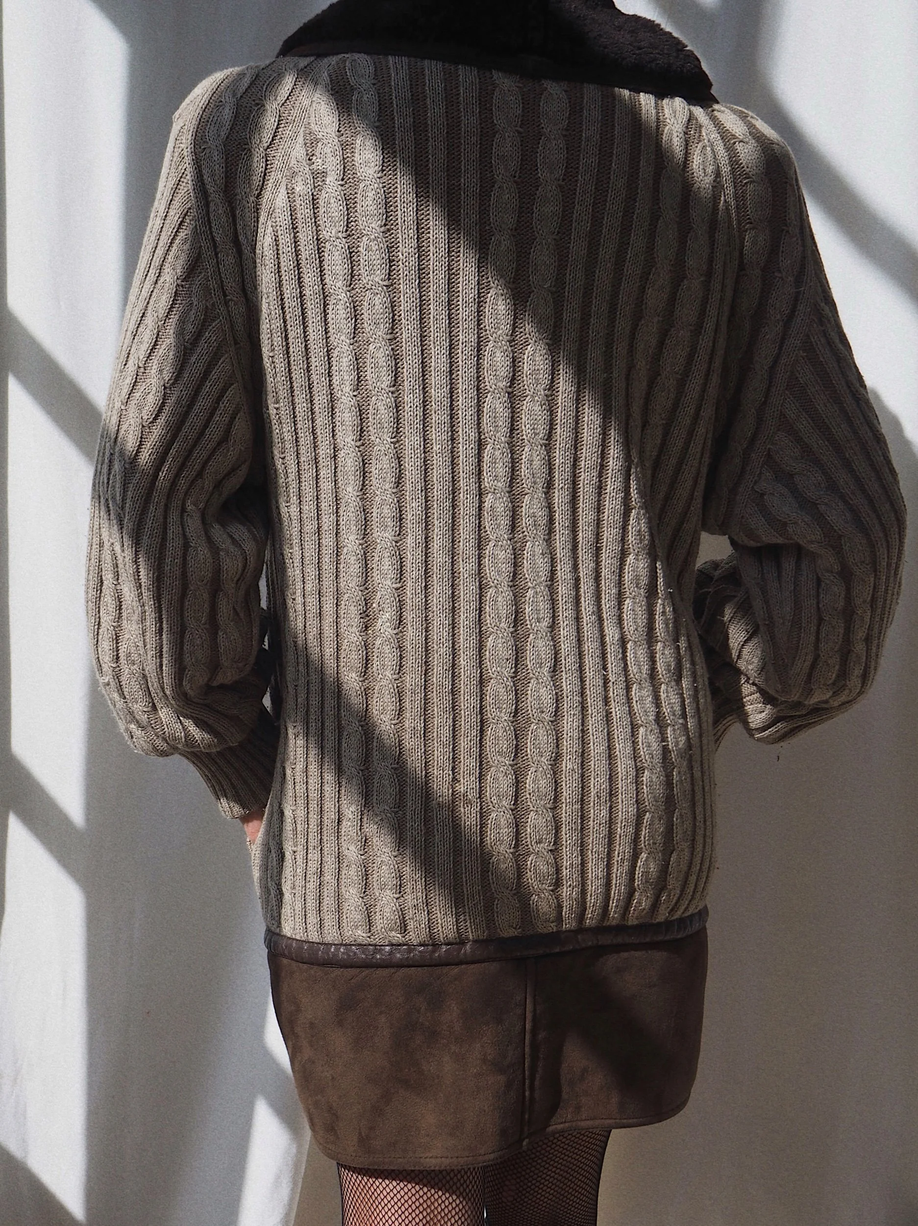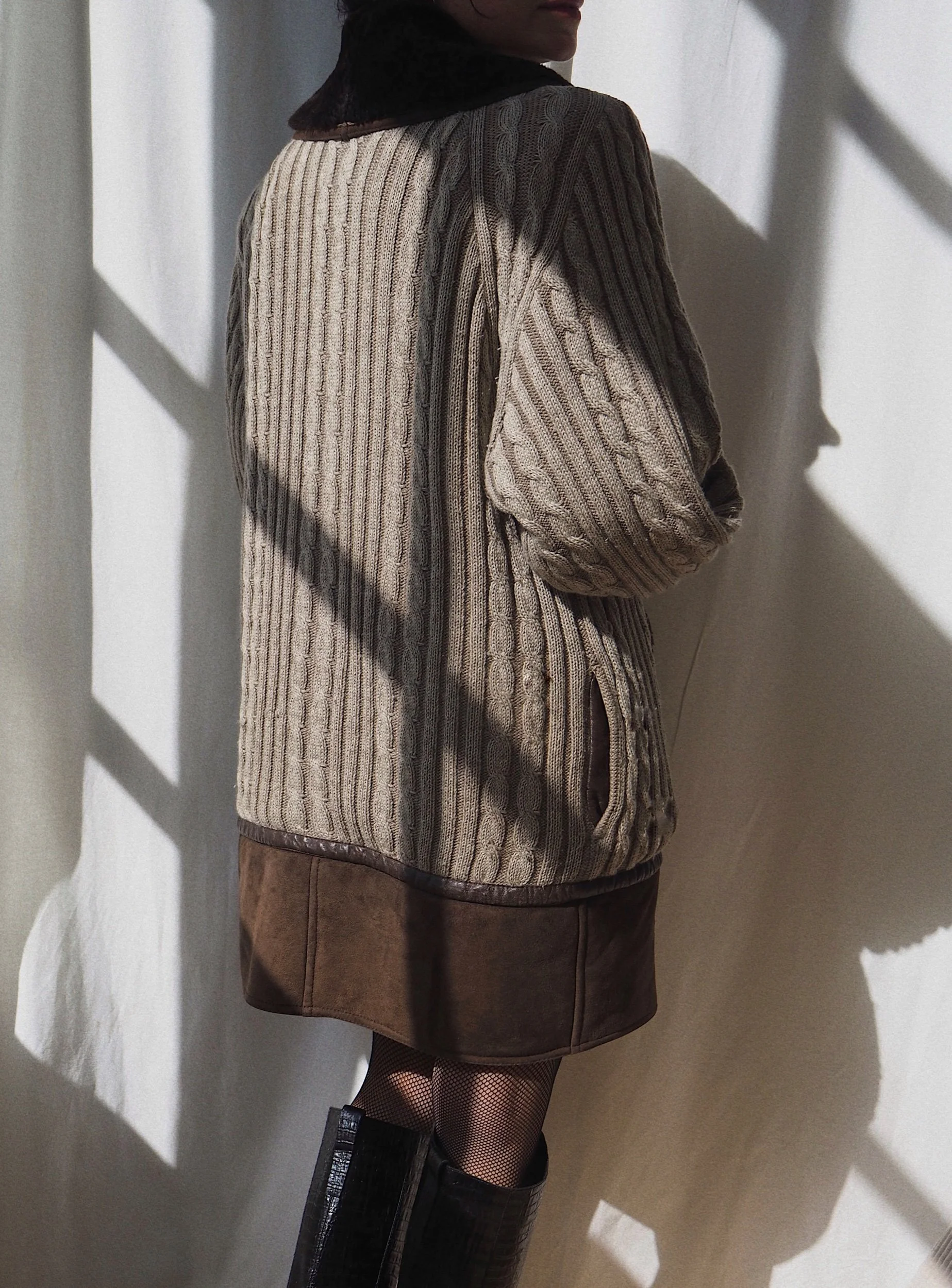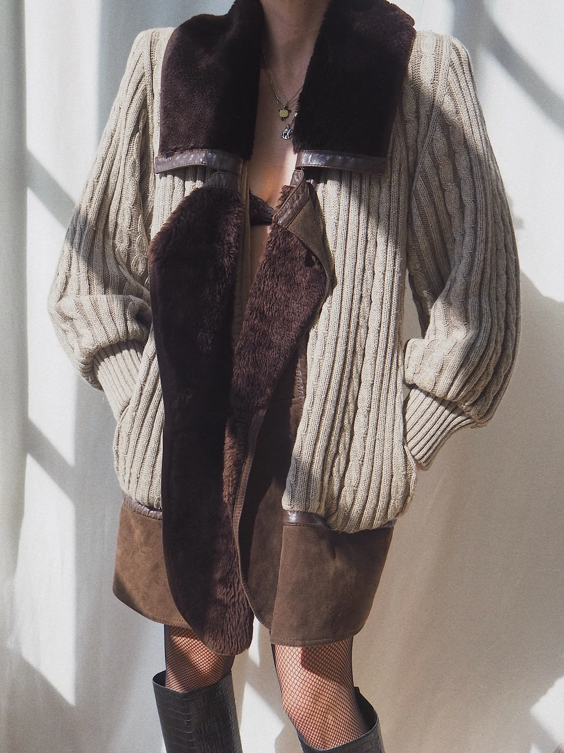 knit on the outside, fully lined on the inside, with faux fur trim & leather details, to be worn open