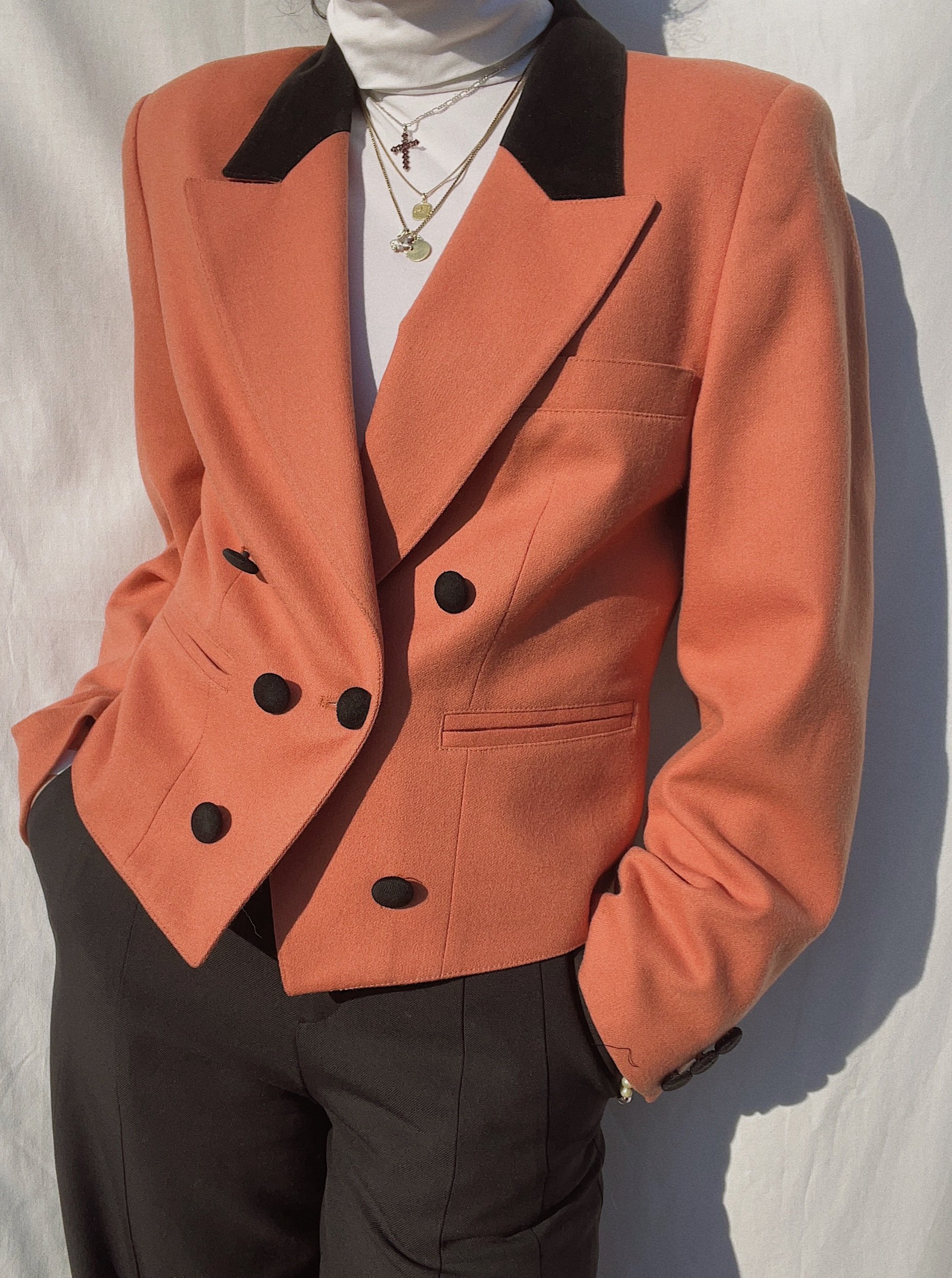 100% merino wool, fully lined, very light shoulderpads, pockets, velvet details, tagged as size 38