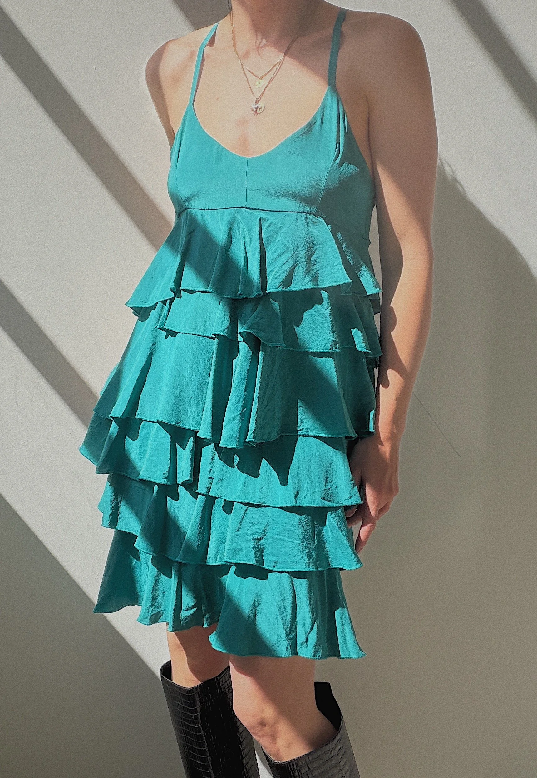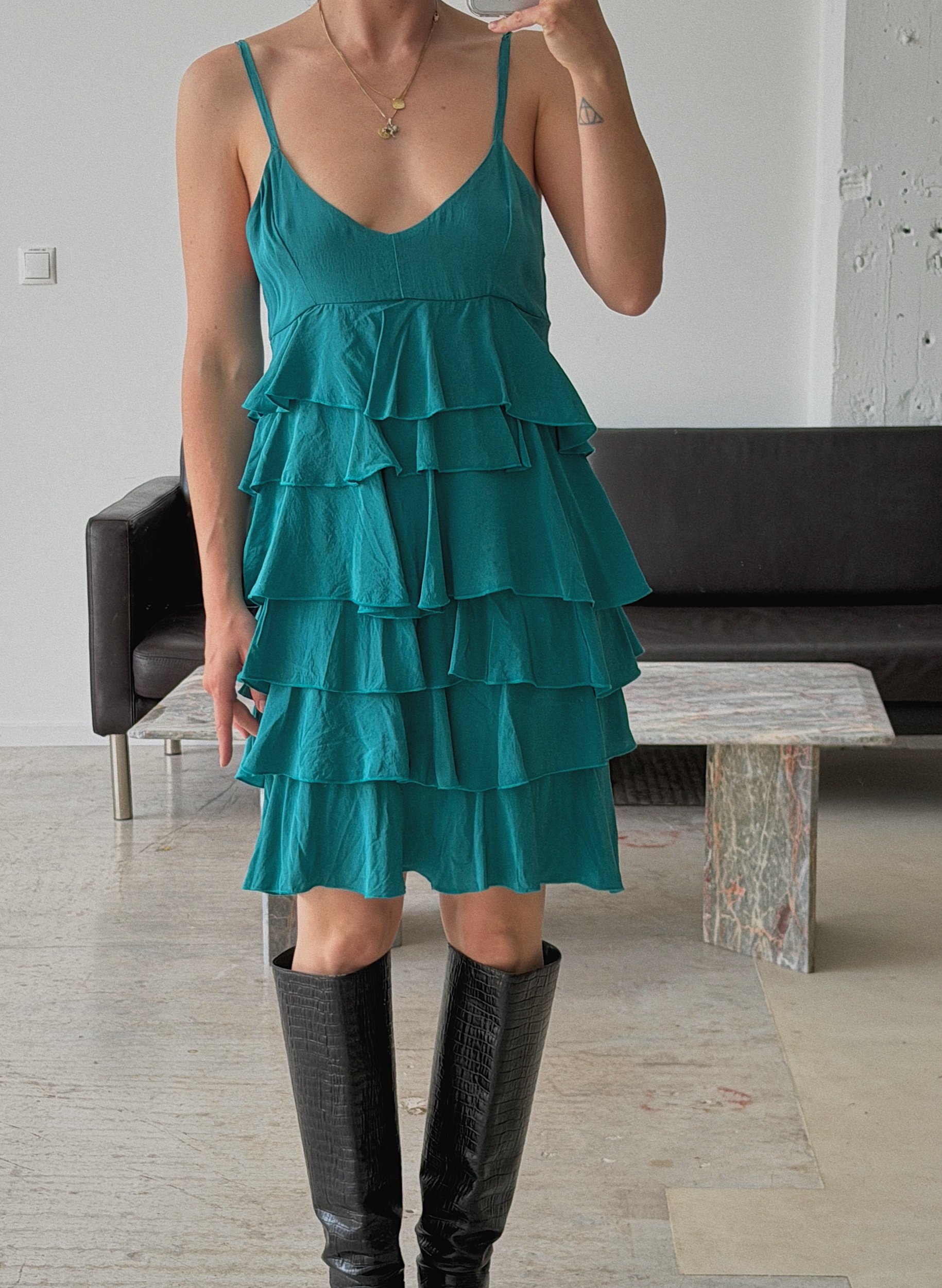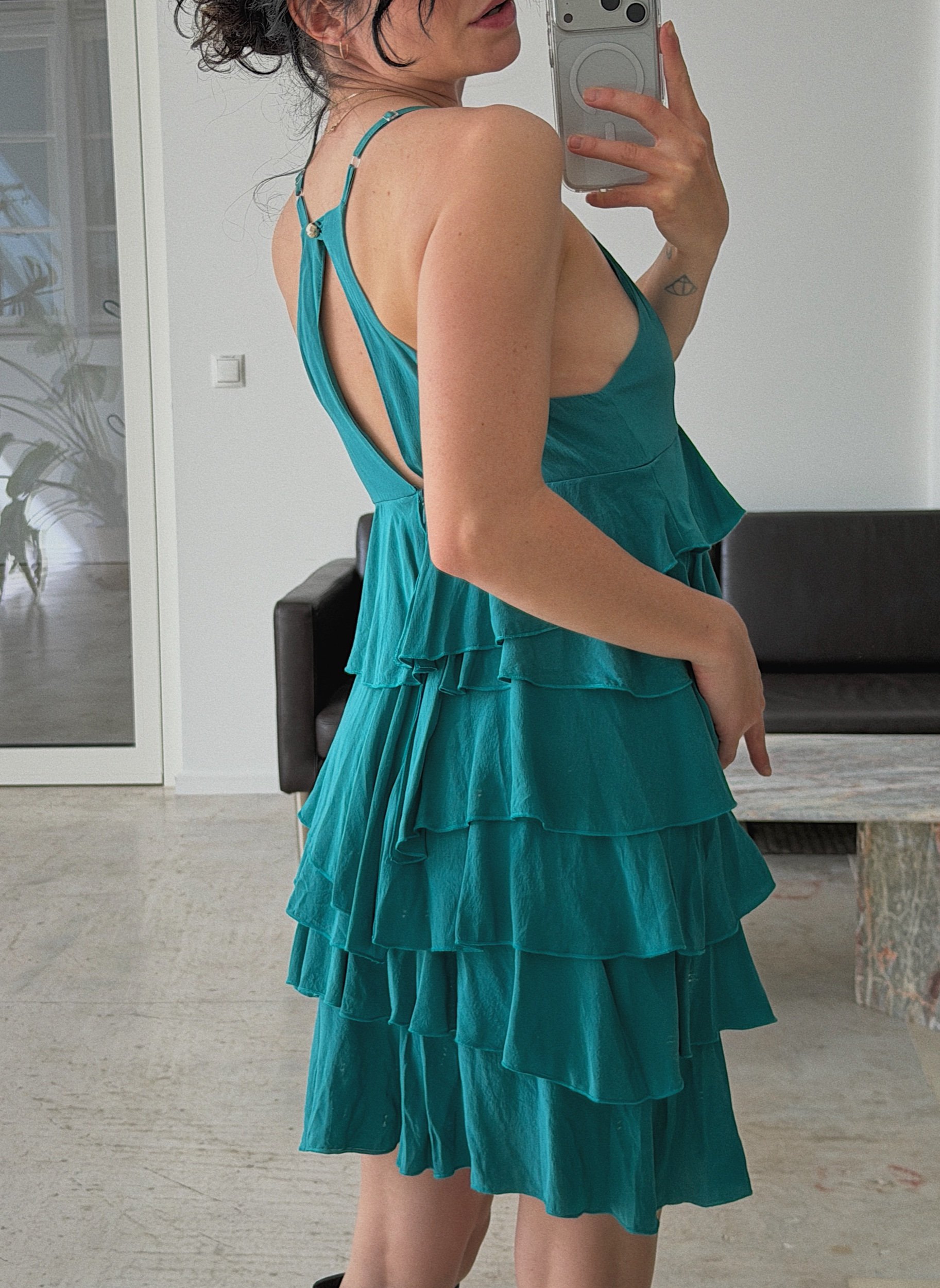 100% silk dress, with mesh lining (stretchy), droplet cut out on the back, zipper & button closure, adjustable straps, A-Line cut, fits loose on a size 36, fits perfectly on a size 38/40