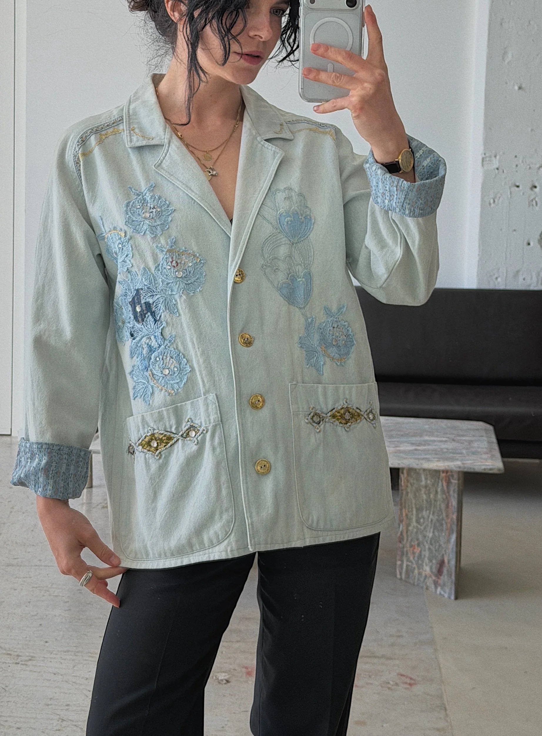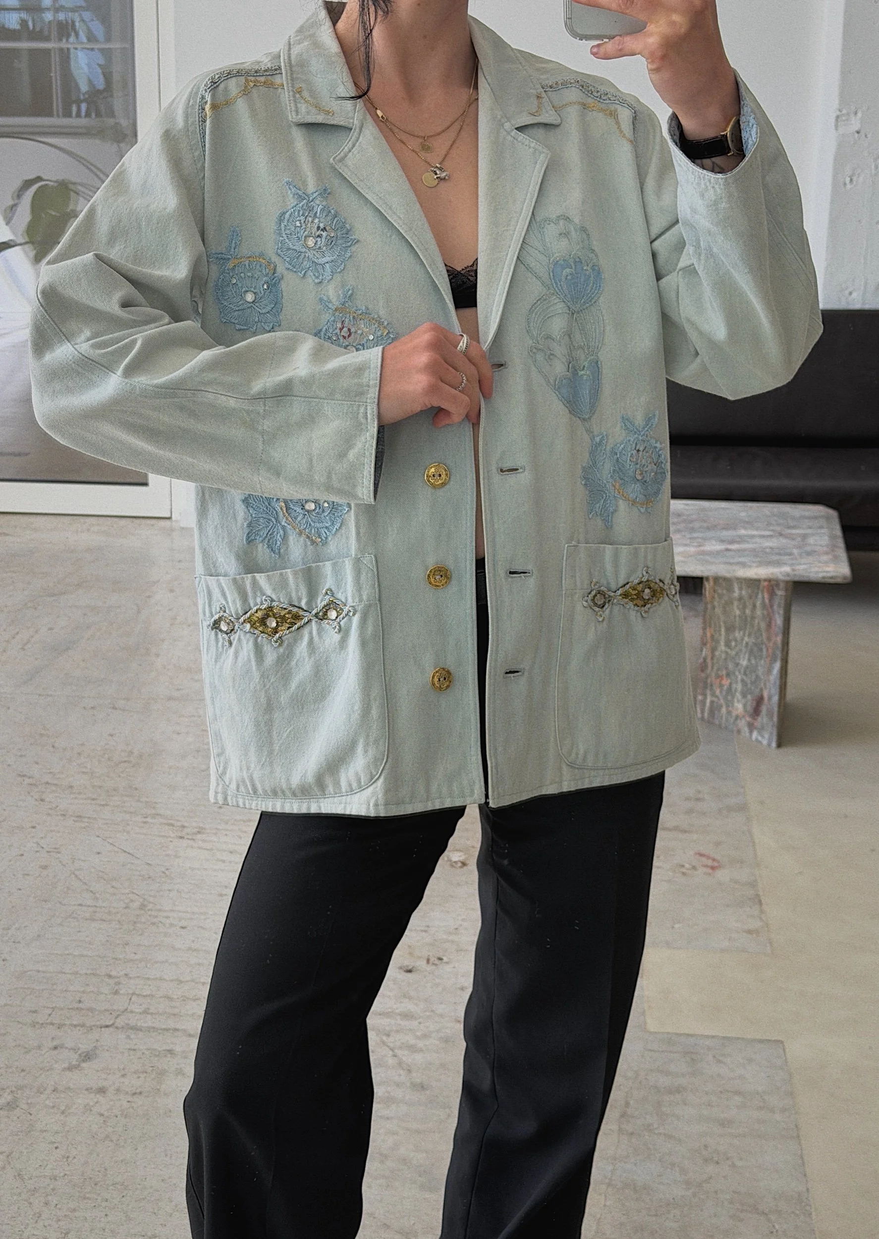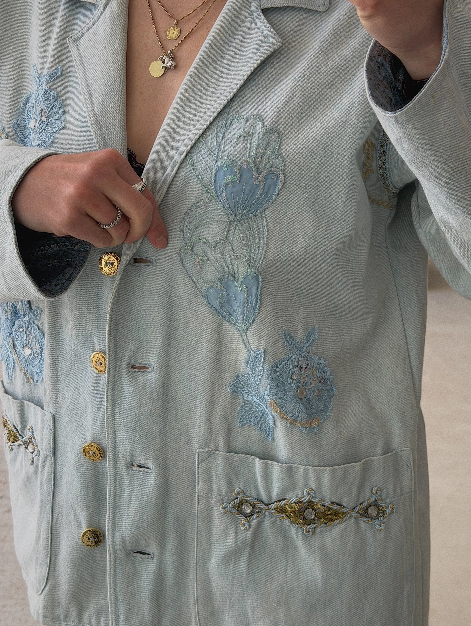 cotton denim with lace and embroidery details, boxy cut, cute jacquard lining