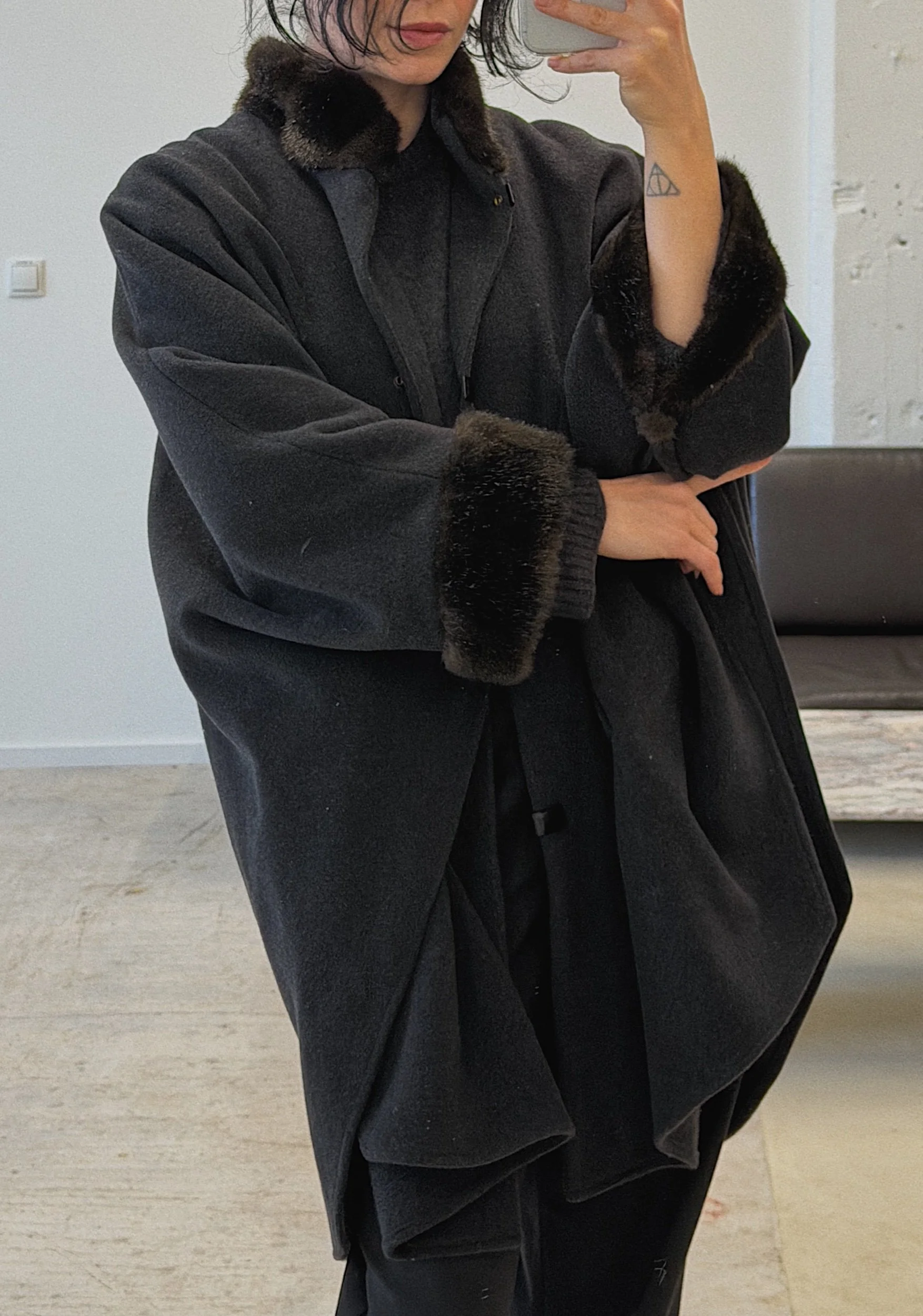 80% merino wool, 20% polyamide, faux fur trim, snap closure on the front, side pockets